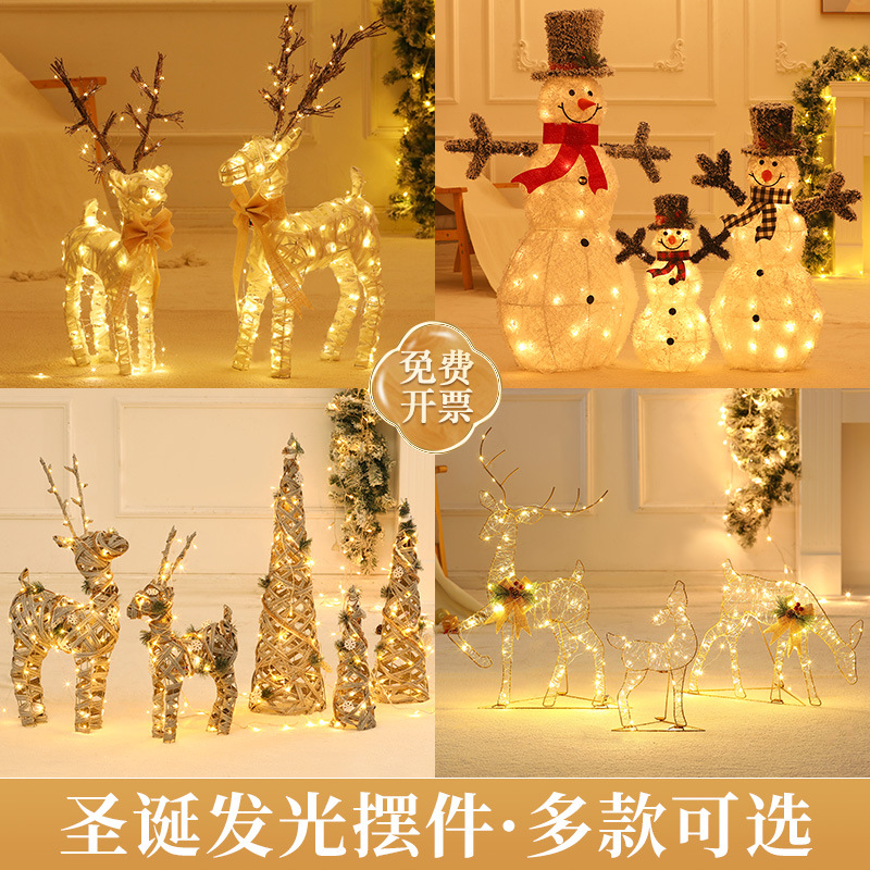 クリスマスの装飾品が光るヘラジカ雪だるまがデパートのショーウインドーにクリスマスツリーの下の装飾品を飾る