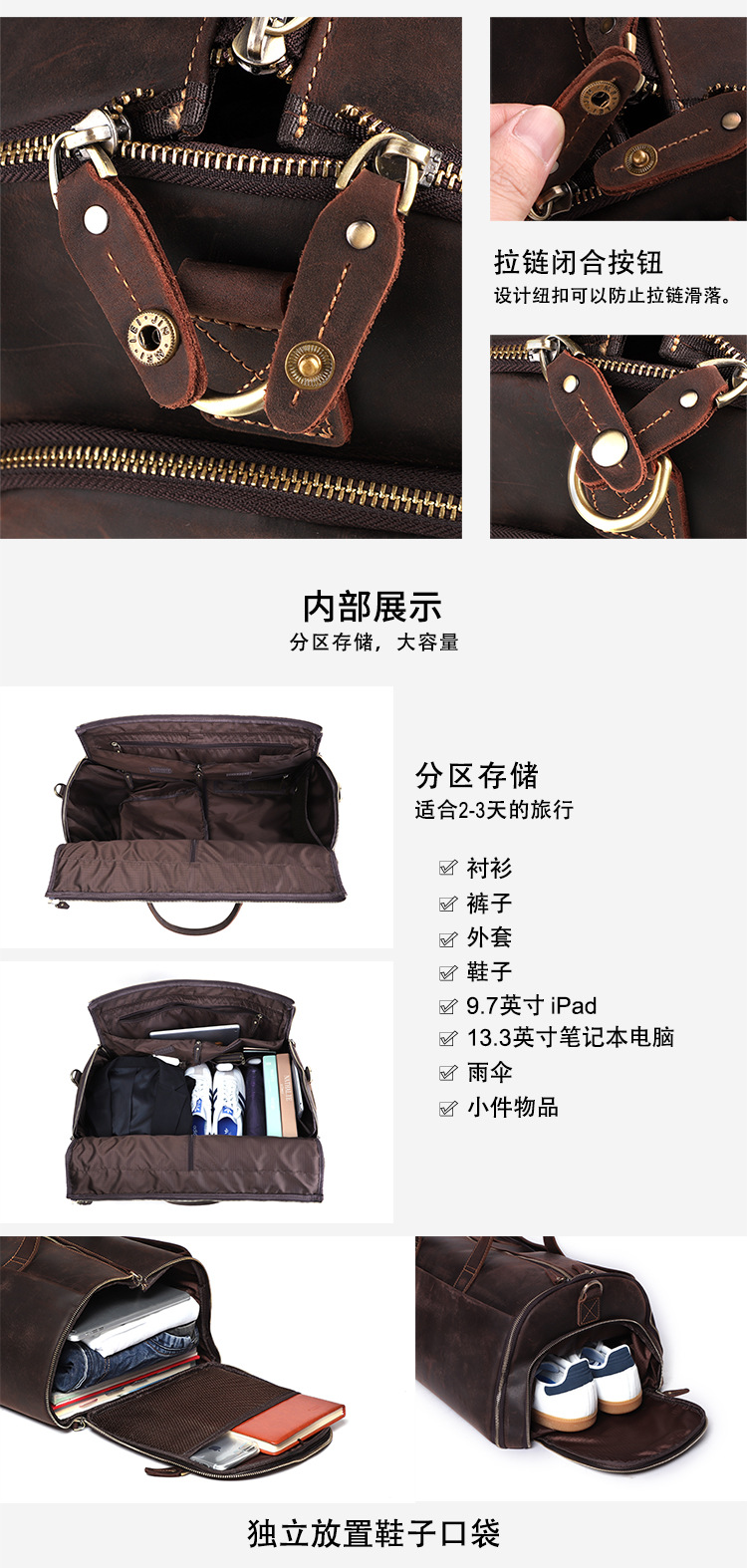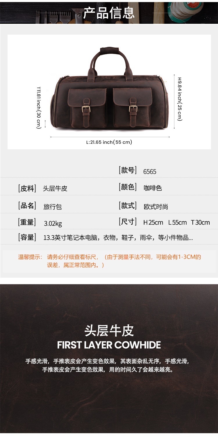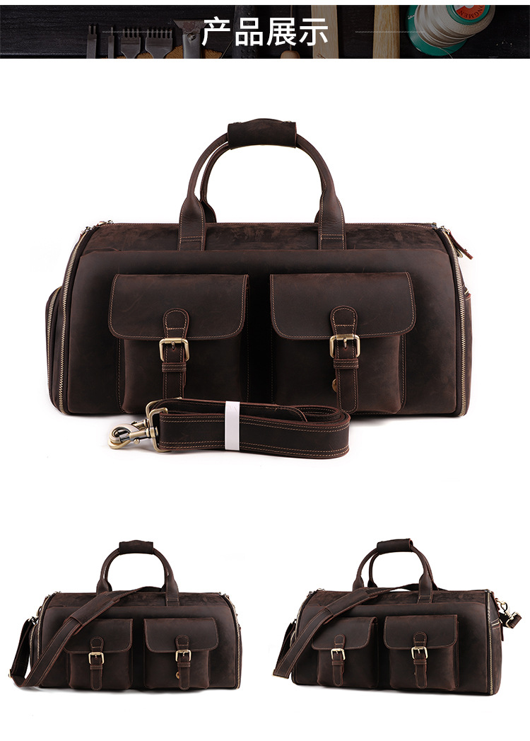 狂馬皮レトロ旅行バッグトップ層牛革大容量多機能乾湿分離スーツ旅行ハンドバッグ
