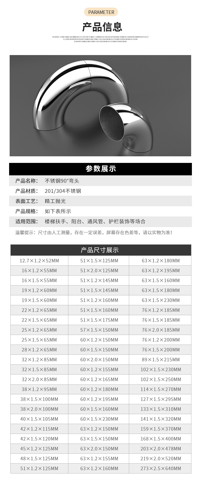 12.7x1.2x55エルボ (正304),16x1.2x55エルボ (正304),16x1.2x50エルボ (正304),19x1.2x65エルボ (正304),19x1.5x65エルボ (正304),22x1.2x65エルボ (正304),22x1.5x65エルボ (正304),25x1.2x65エルボ (正304),25x1.5x65エルボ (正304),25x2.0x65エルボ (正304),28x1.2x78エルボ (正304),28x1.5x78エルボ (正304),30x1.2x78エルボ (正304),30x1.5x100エルボ (正304),32x1.2x85エルボ (正304),32x1.5x85エルボ (正304),32x2.0x85エルボ (正304),38x1.2x100エルボ (正304),38x1.5x100エルボ (正304),38x2.0x100エルボ (正304),40x1.5x125エルボ (正304),42x1.5x105エルボ (正304),42x2.0x105エルボ (正304),45x1.5x125エルボ (正304),48x1.2x120エルボ (304),48x1.2x120エルボ (正304),48x1.5x125エルボ (正304),51x1.2x125エルボ (304),51x1.2x125エルボ (正304),51x1.5x125エルボ (304),51x1.5x125エルボ (正304),51x2.0x125エルボ (正304),57x1.5x150エルボ (正304),60x1.2x150エルボ (304),60x1.2x150エルボ (正304),60x1.5x150エルボ (304),60x1.5x150エルボ (正304),60x2.0x150エルボ (正304),63x1.2x150エルボ (304),63x1.2x150エルボ (正304),63x1.5x150エルボ (304),63x1.5x150エルボ (正304),63x2.0x150エルボ (304),70x1.5x165エルボ (正304),76x1.2x185エルボ (正304),76x1.5x185エルボ (正304),76x2.0x185エルボ (正304),80x1.5x175エルボ (正304),89x1.2x215エルボ (正304),89x1.5x215エルボ (正304),89x2.0x225エルボ (正304),100x2.0x204エルボ (正304),102x1.2x230エルボ (正304),102x1.5x230エルボ (正304),102x2.0x235エルボ (正304),108x1.2x250エルボ (正304),108x1.5x250エルボ (正304),108x2.0x250エルボ (正304),114x1.2x270エルボ (正304),114x1.5x270エルボ (正304),114x2.0x270エルボ (正304),120x1.5x285エルボ (正304),127x1.5x295エルボ (正304),127x2.0x275エルボ (正304),133x1.5x310エルボ (正304),133x2.0x310エルボ (正304),141x 1.5x325エルボ (正304),142x2.0x325エルボ (正304),150x1.5x360エルボ (正304),152x1.5x365エルボ (正304),159x1.5x370エルボ (正304),159x2.0x370エルボ (正304),168x1.5x400エルボ (正304),168x2.0x400エルボ (正304),180x1.5x425エルボ (正304),203x1.5x475エルボ (正304),219x2.5x520エルボ (正304),255x1.5x540エルボ (正304),273x3.0x650エルボ (正304),325x3.0 x710エルボ (正304)