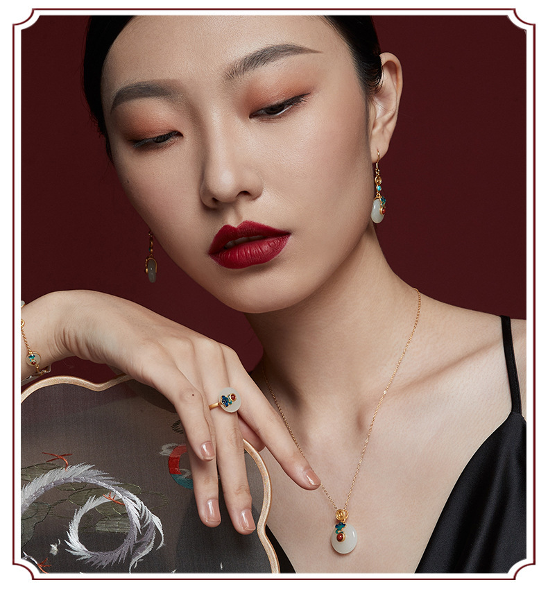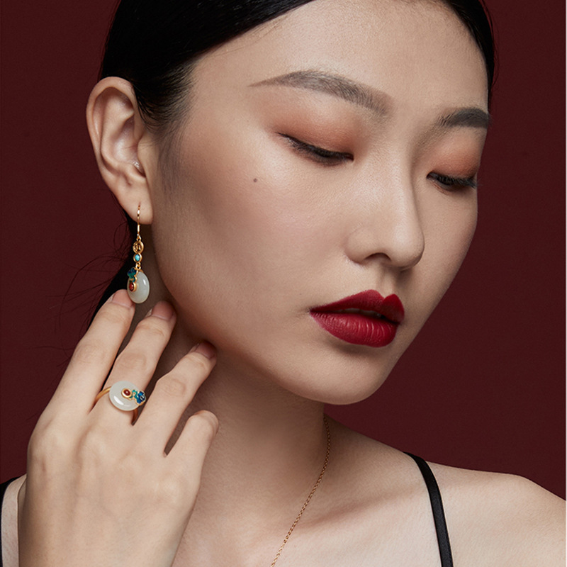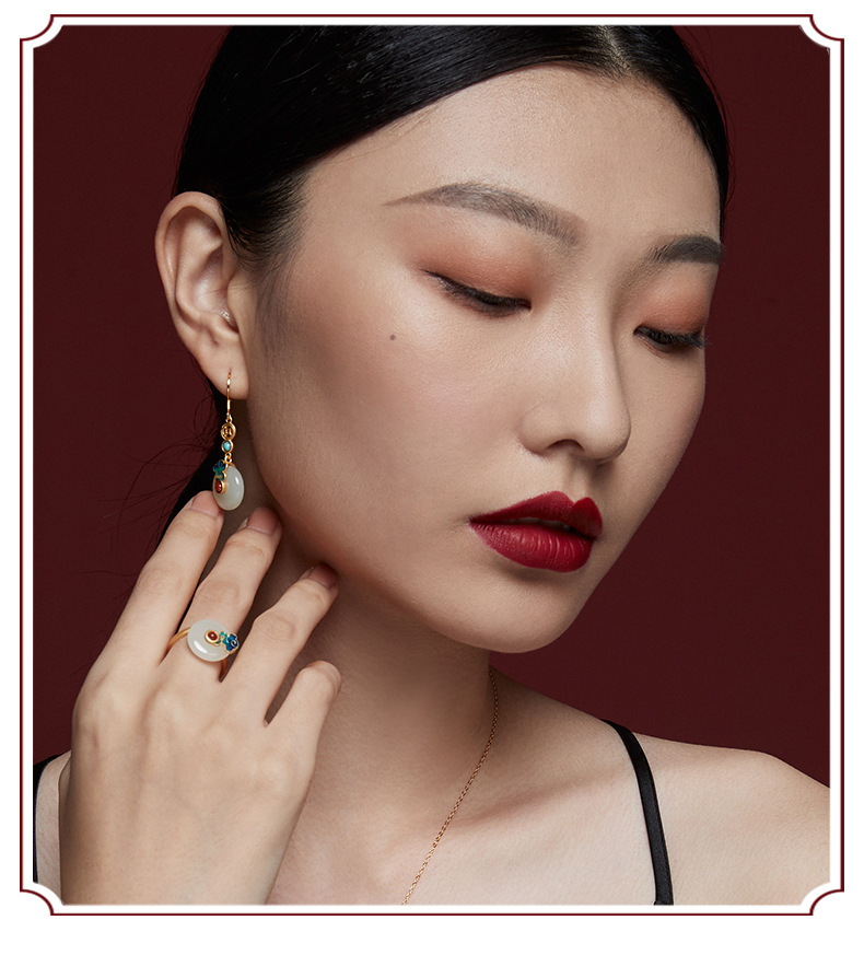 天然模造和田玉二重環平安扣イヤリング、国民的ファッション、環が連なるイヤーフック、民族風ジュエリー