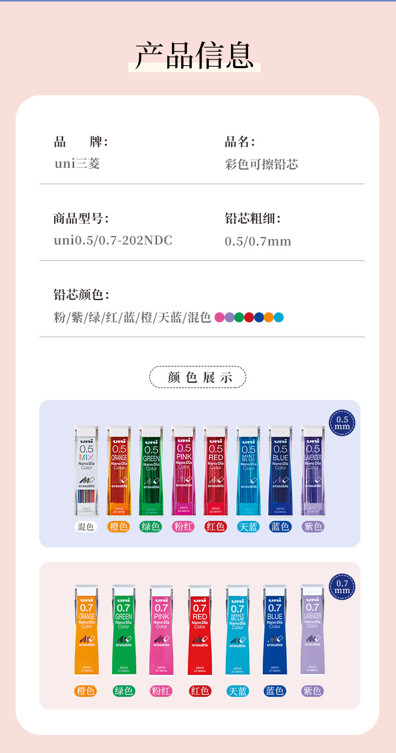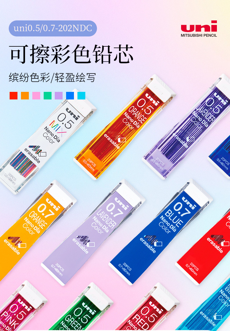 三菱 (ユニ) UNI0.5-202NDCカラー拭き取り可能铅笔芯0.5mm自动铅笔芯20本/チューブ