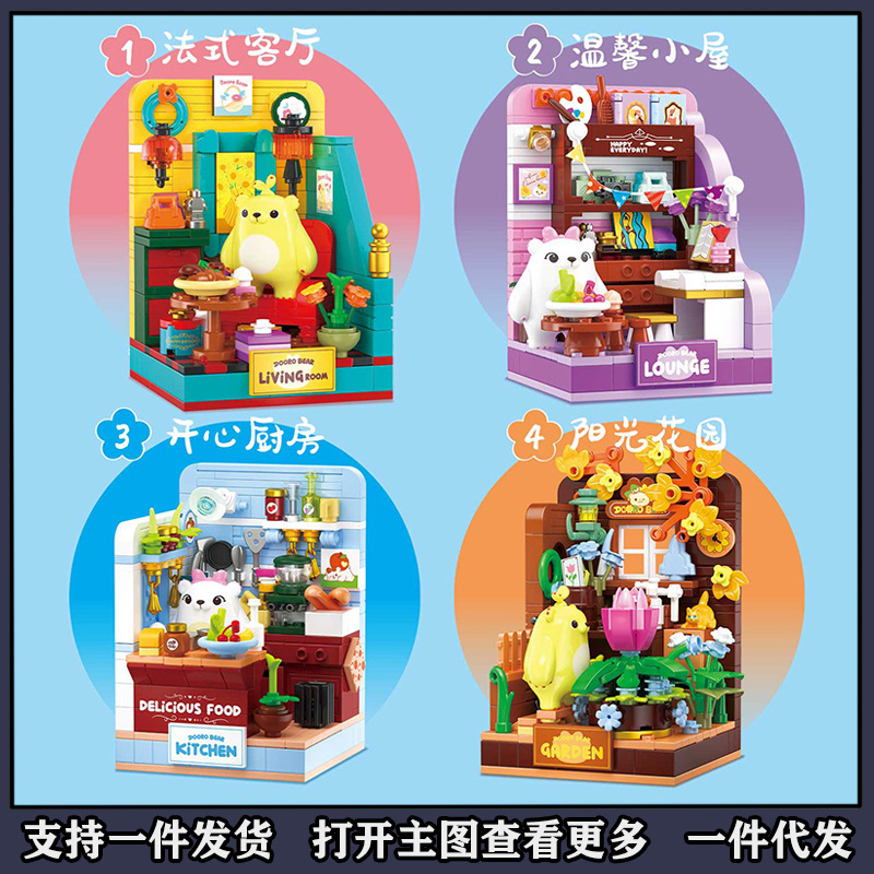 萌芽熊の家のフランス式客間に積み木662039のアイデアを組み合わせておもちゃの手を作ってテーブルを飾ってプレゼントします。