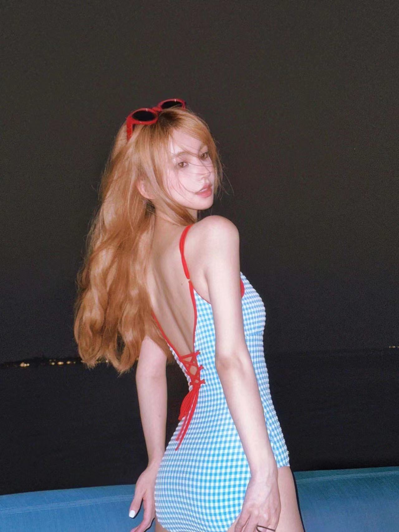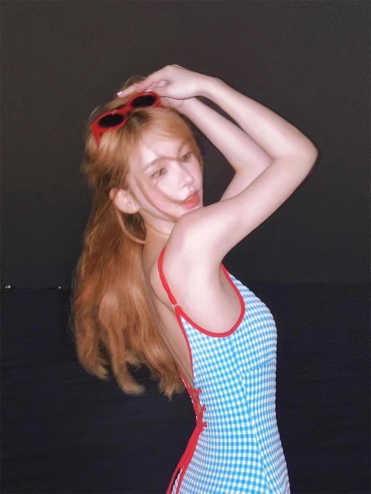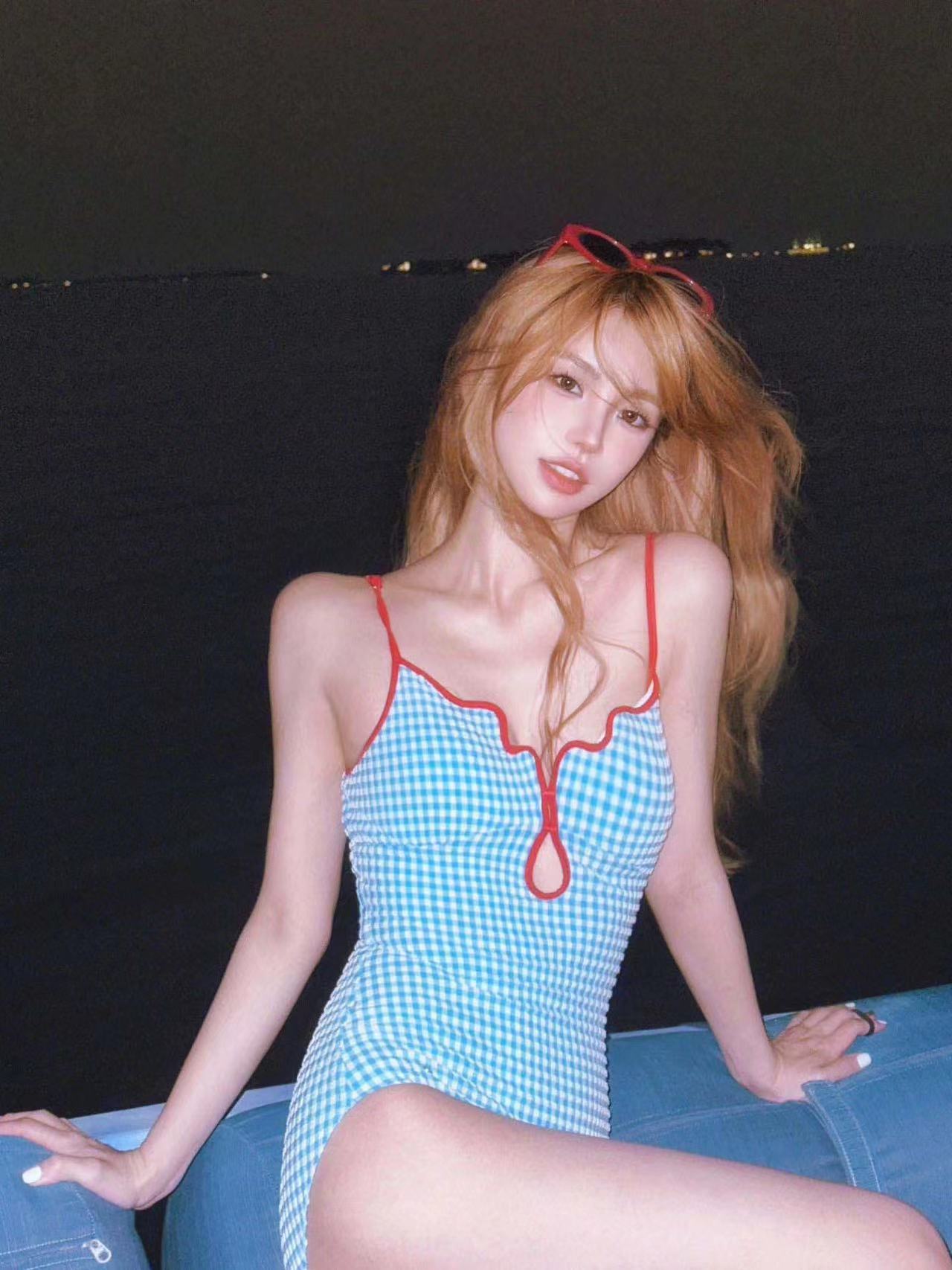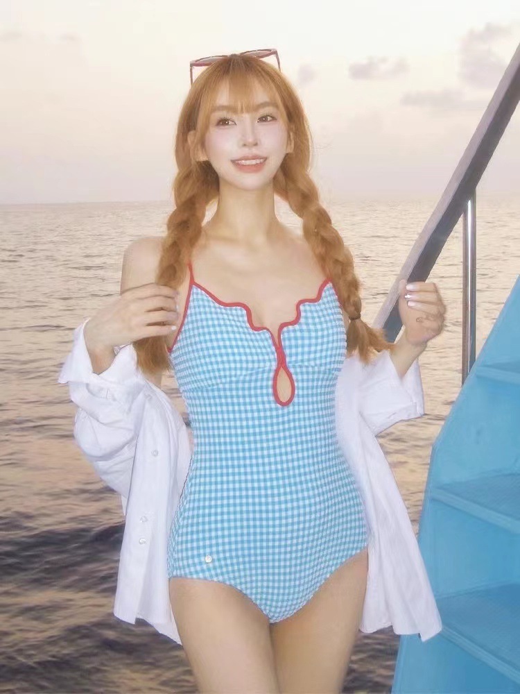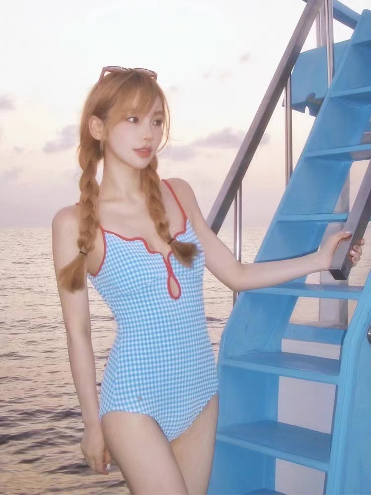 水着の青い格子の少女のブラウスの長袖は腹を隠してやせています。