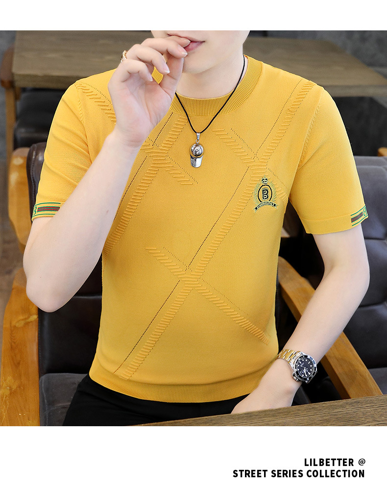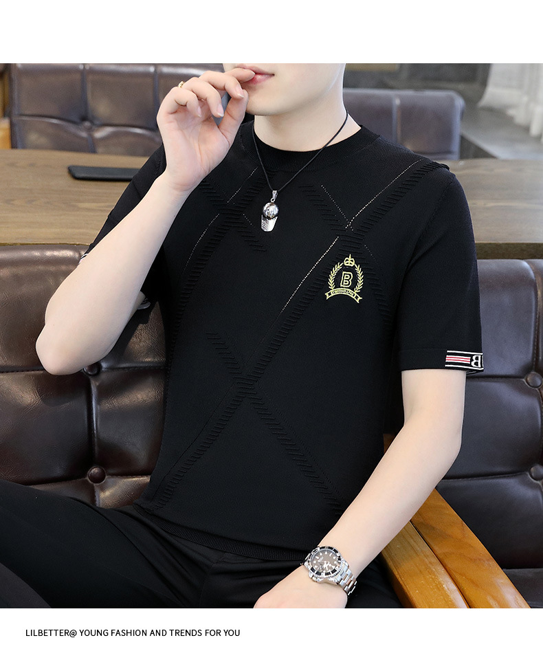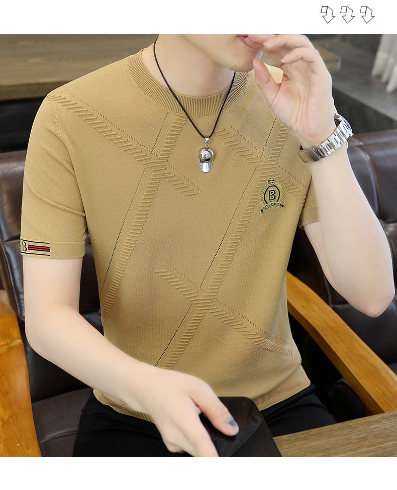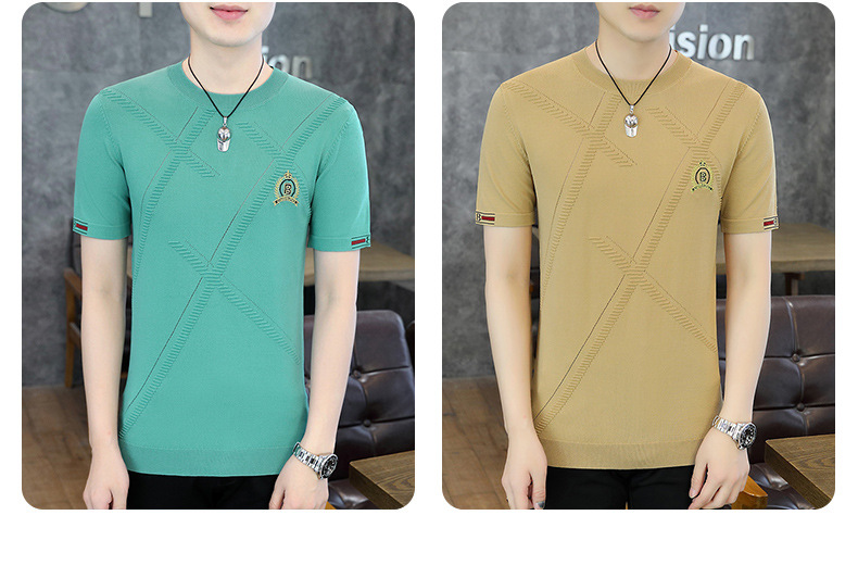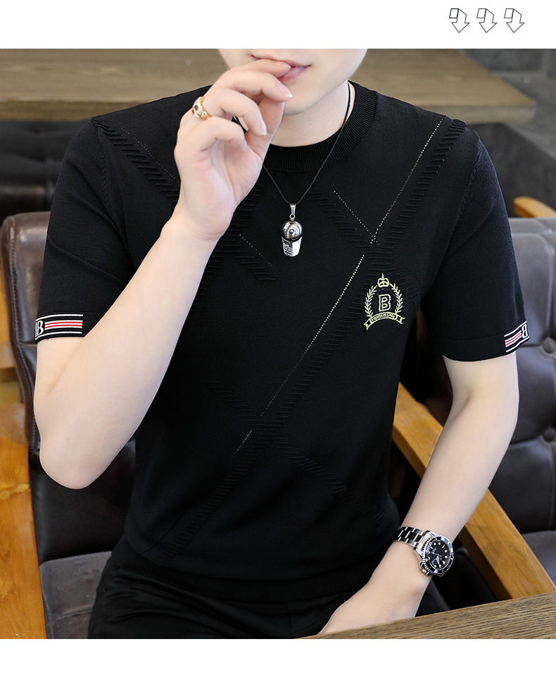 夏の薄い氷糸半袖tシャツ男性3d刺繍ニット半袖tシャツ夏服上着ブーム