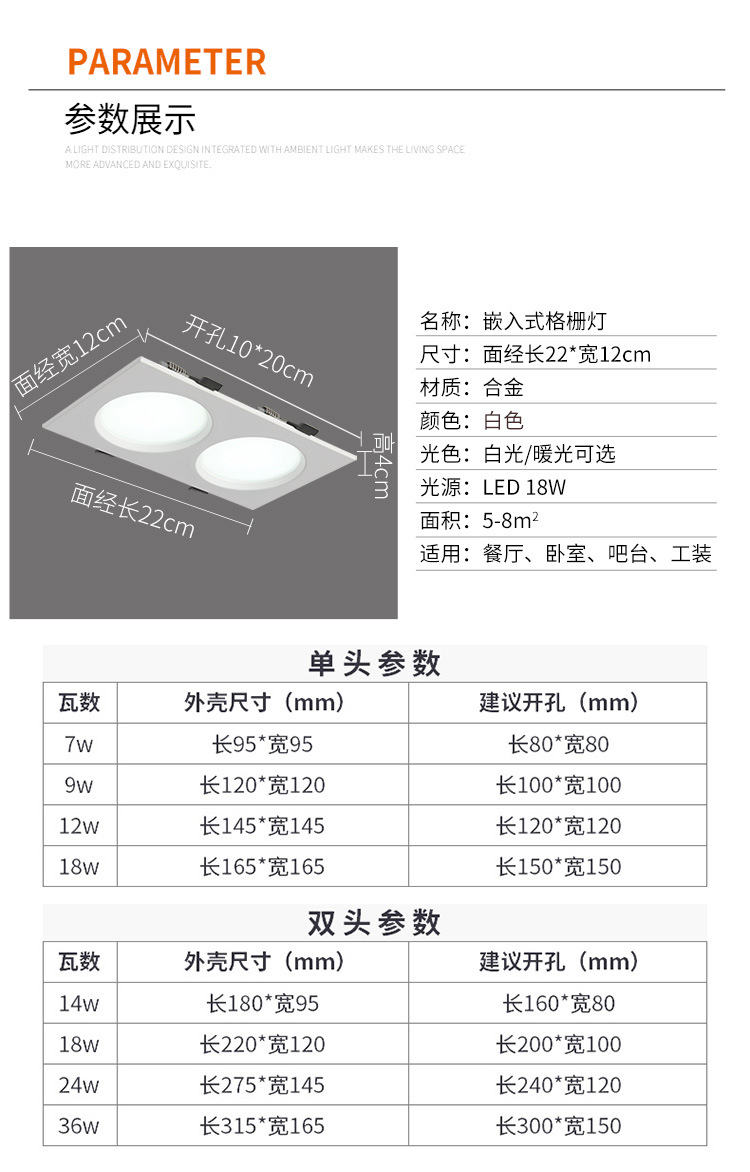 光源パワー シングルヘッド 7ワット 開口部7-8cm,シングルヘッド9ワット穴あけ9-10cm,シングルヘッド12ワット穴あけ11-12cm,シングルヘッド18ワット穴あけ14-15cm,ダブルヘッド 7ワット*2 開口部8*16cm,ダブルヘッド9ワット * 2穴あけ10*20cm,ダブルヘッド12ワット * 2穴あけ12*24cm,ダブルヘッド18ワット * 2穴あけ15*30cm