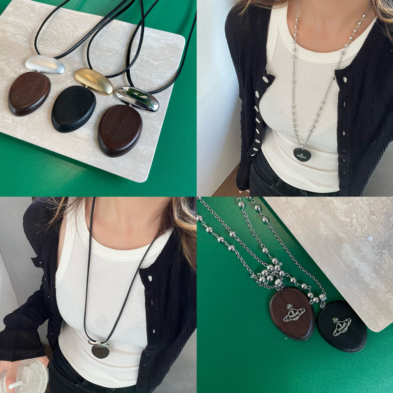 小众设计椭圆木质金属拼接吊坠项链高级感百搭可调节长款毛衣链