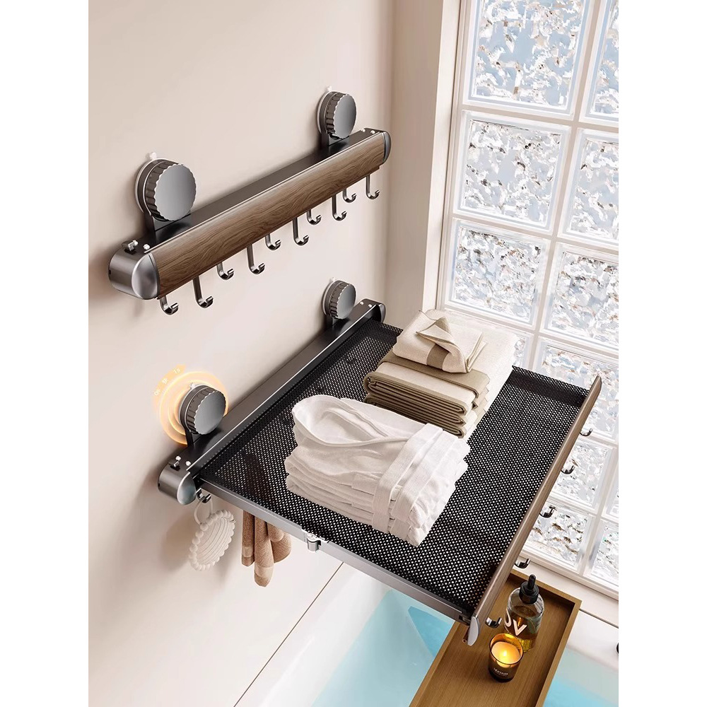 铝合金吸盘晾晒网兜免打孔浴室置物架实木可伸缩晾晒架晒干货神器