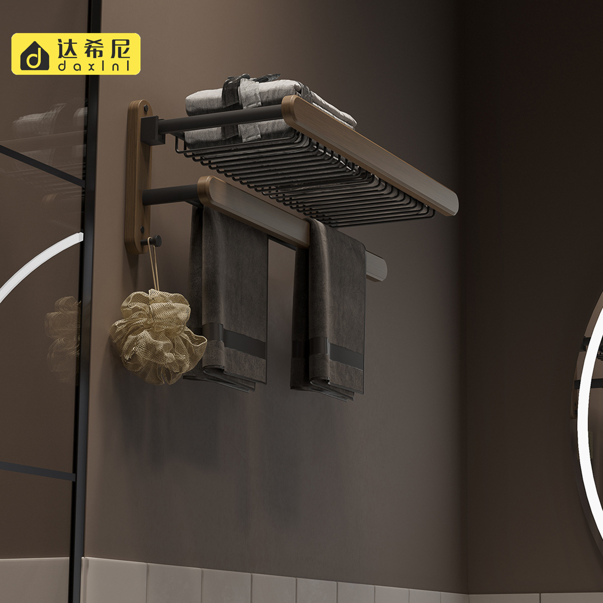 穴なし折り畳み可能なバスタオル棚浴室黒胡桃木タオル掛けトイレ多機能実木タオル掛け