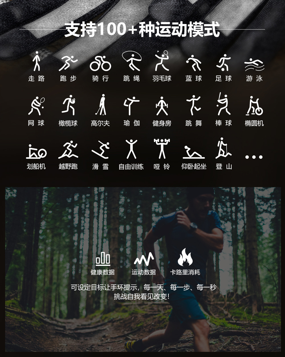 运动/100+种模式: | 8种常用运动模式:健走、跑步、登山、骑行、蓝球、游泳、羽毛球、足球;通过APP可以添加: 网球、橄榄球、高尔夫、瑜伽、健身房、跳舞、棒球、椭圆机、划船机、越野跑、滑雪、保龄球、哑铃、仰卧起坐 、自由训练、等100+种运动 | ||