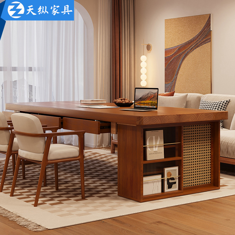 天縦客間白蝋木大長机読書学習机家庭用本棚一体引き出し付き実木デスク