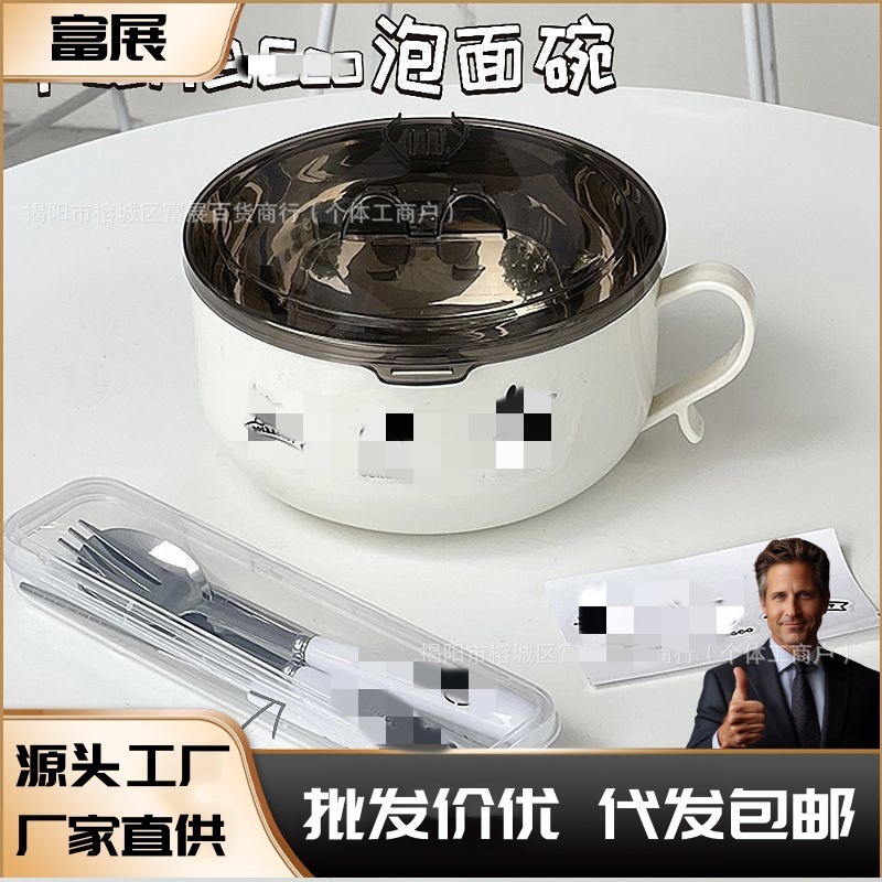 不锈钢三只狗泡面碗带盖+餐具宿舍日系大容量沥水方便面碗