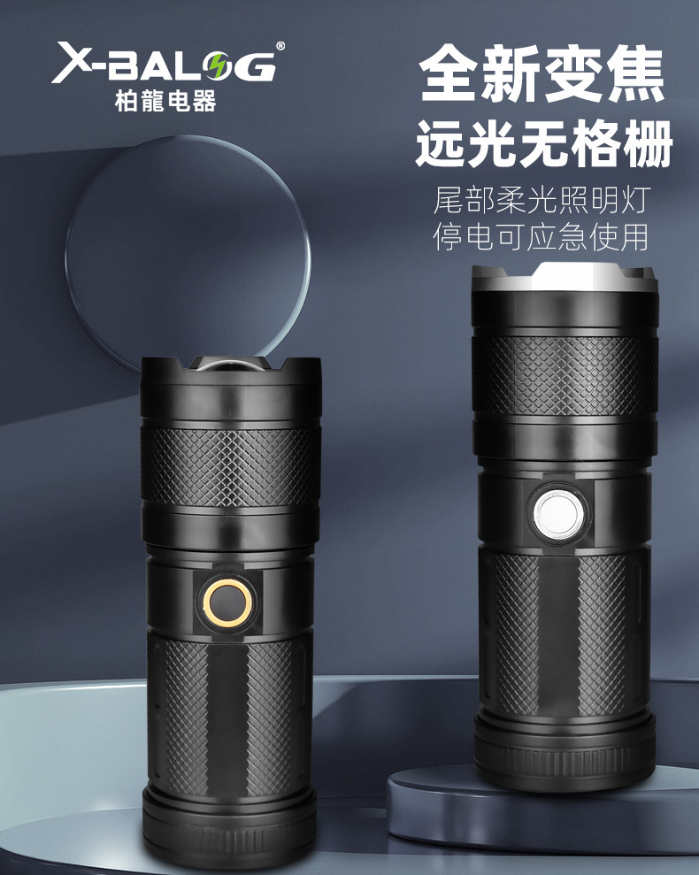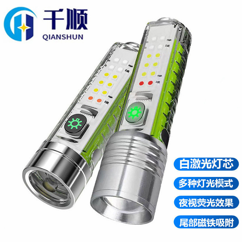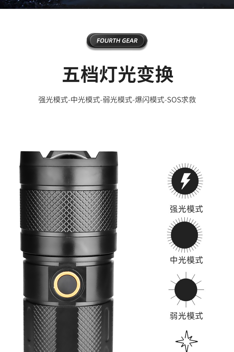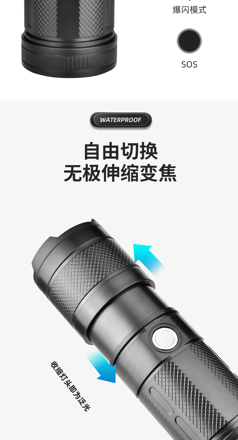 クロスボーダー強光懐中電灯遠射白レーザー屋外多機能伸縮ズームプラスチック懐中電灯テール照明
