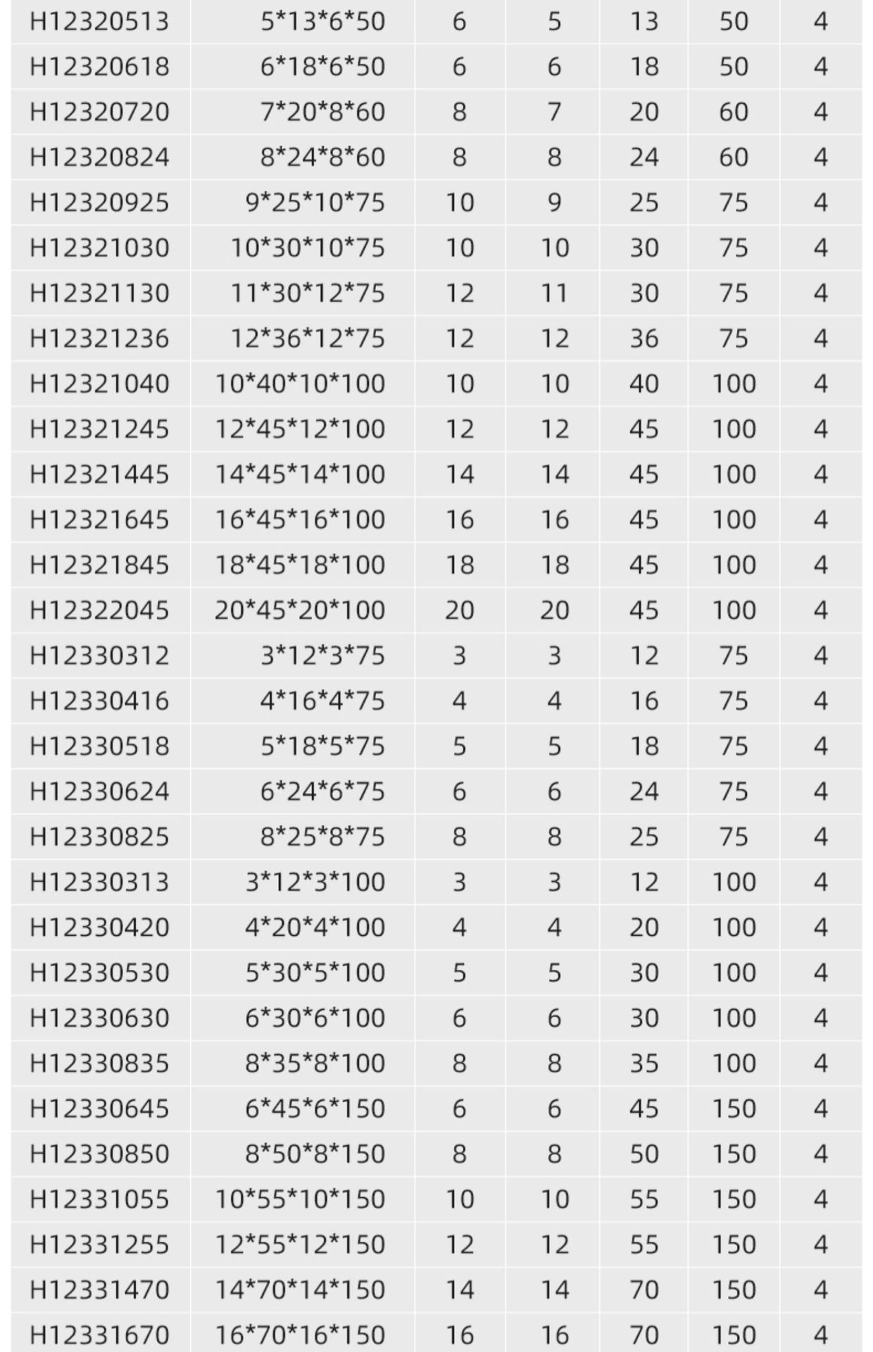 型番 1*3*4d * 50l,1.5*4d * 4*50l,2*6*4d * 50l,2.5*8*4d * 50l,3*9 * 3d * 50l,3*9*4d * 50l,3.5*11*4d * 50l,4*12*4d * 50l,5*13 * 5d * 50l,5*13*6d * 50l,6*18*6d * 50l,7*20*8d * 60l,8*24*8d * 60l,3*12 * 3d * 75l,4*16*4d * 75l,5*18 * 5d * 75l,6*24 * 5d * 75l,8*25*8d * 75l,9*25 * 10d * 75l,10*30 * 10d * 75l,11*30 * 12d * 75l,12*36 * 12d * 75l,3*12 * 3d * 100l,4*20*4d * 100l,5*30 * 5d * 100l,6*30*6d * 100l,8*35*8d * 100l,10*40 * 10d * 100l,12*45 * 12d * 100l,14*45 * 14d * 100l,16*45 * 16d * 100l,18*45 * 18d * 100l,20*45 * 20d * 100l,6*45 * 5d * 150l,8*50*8d * 150l,10*55 * 10d * 150l,12*55 * 12d * 150l,14*70 * 14d * 150l,16*70 * 16d * 150l,20*70*20d * 150l