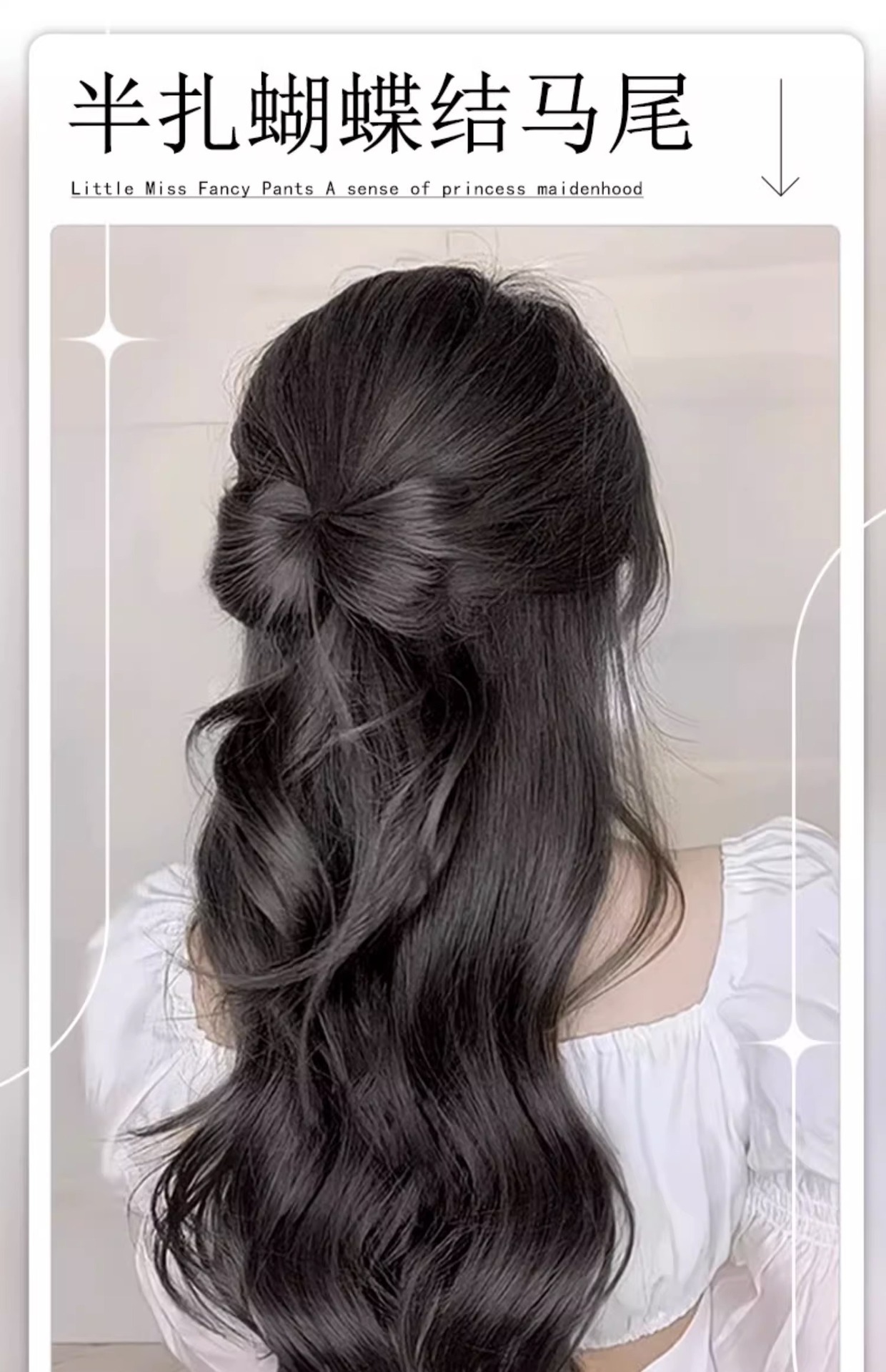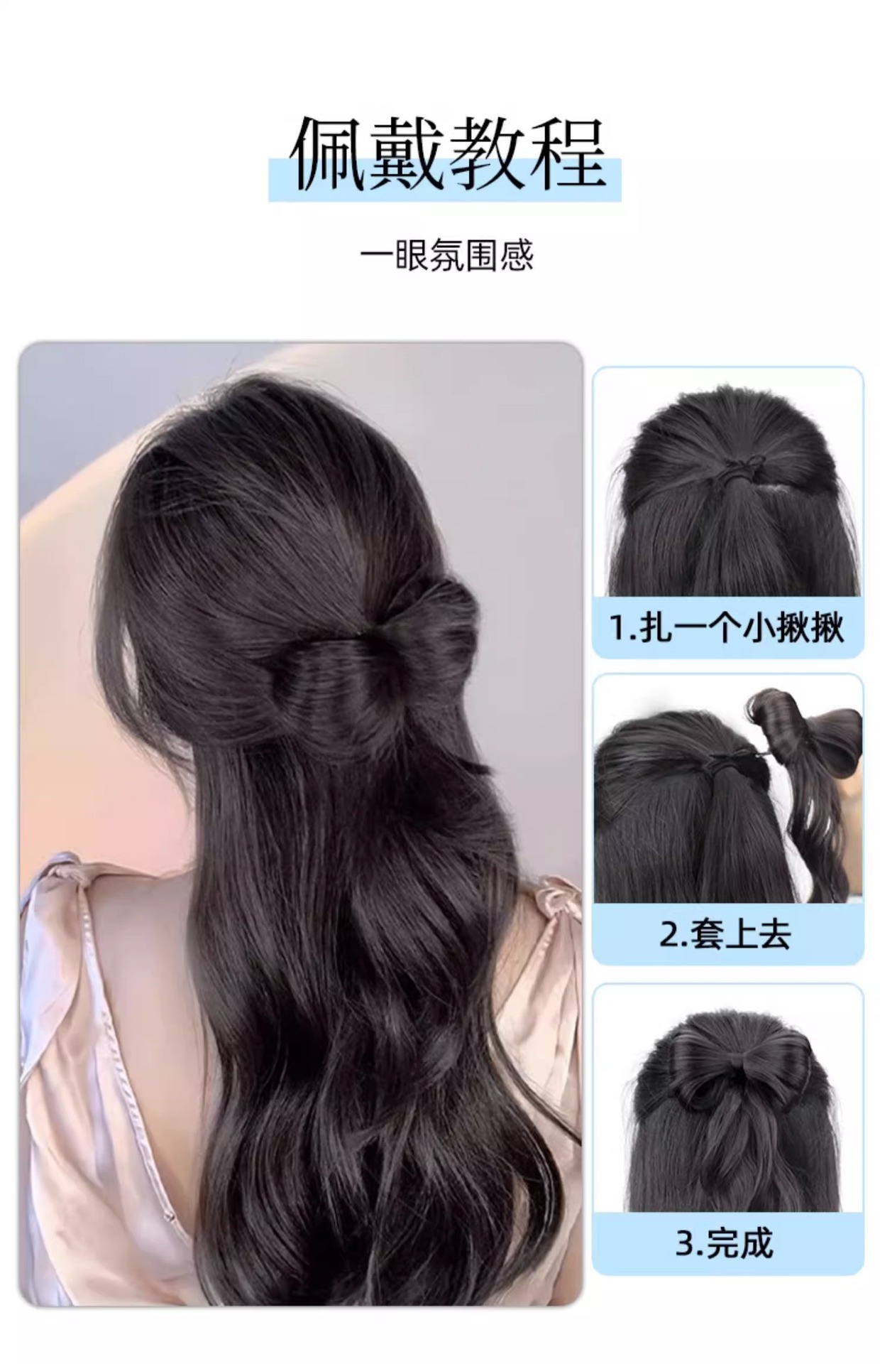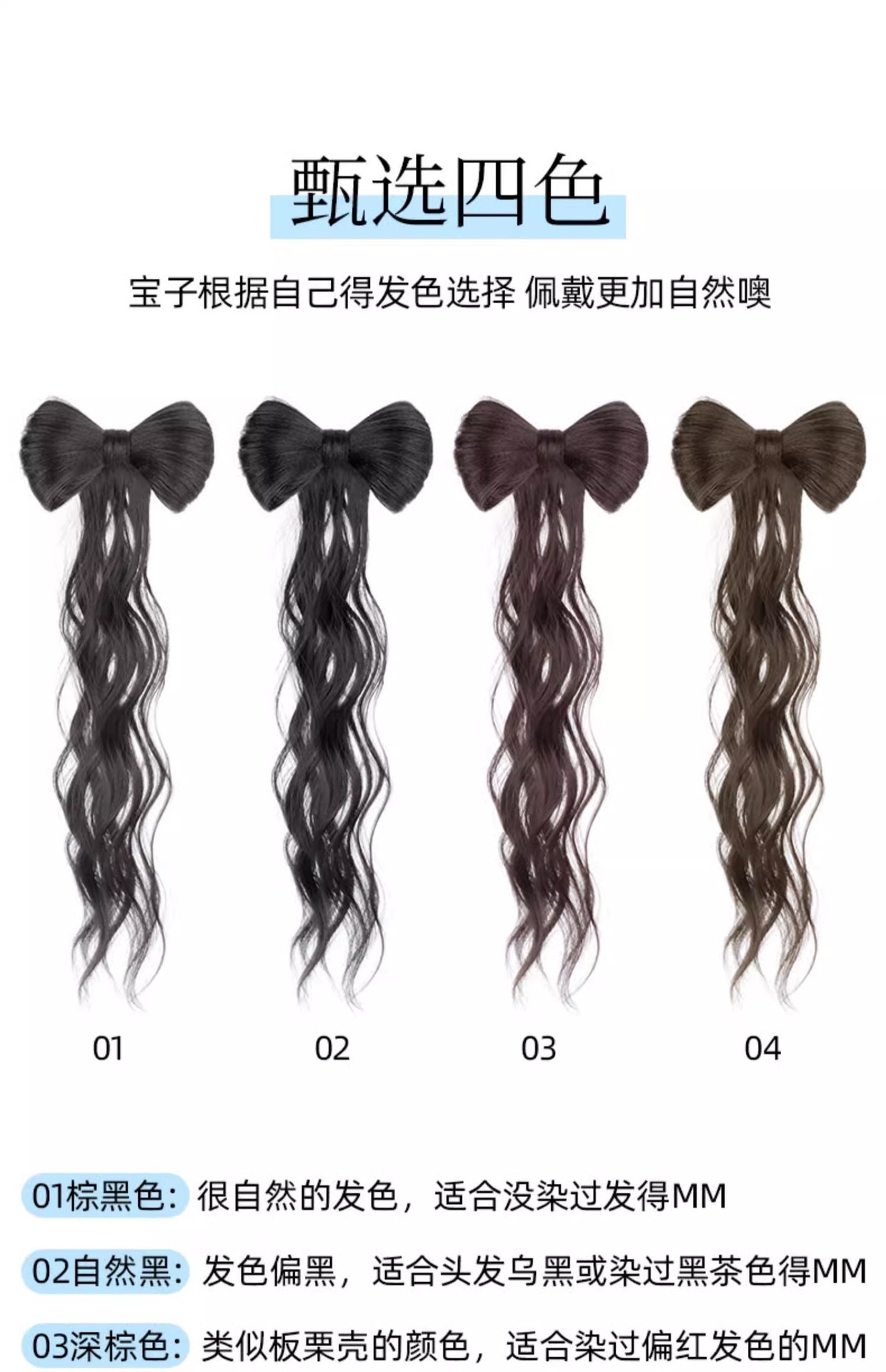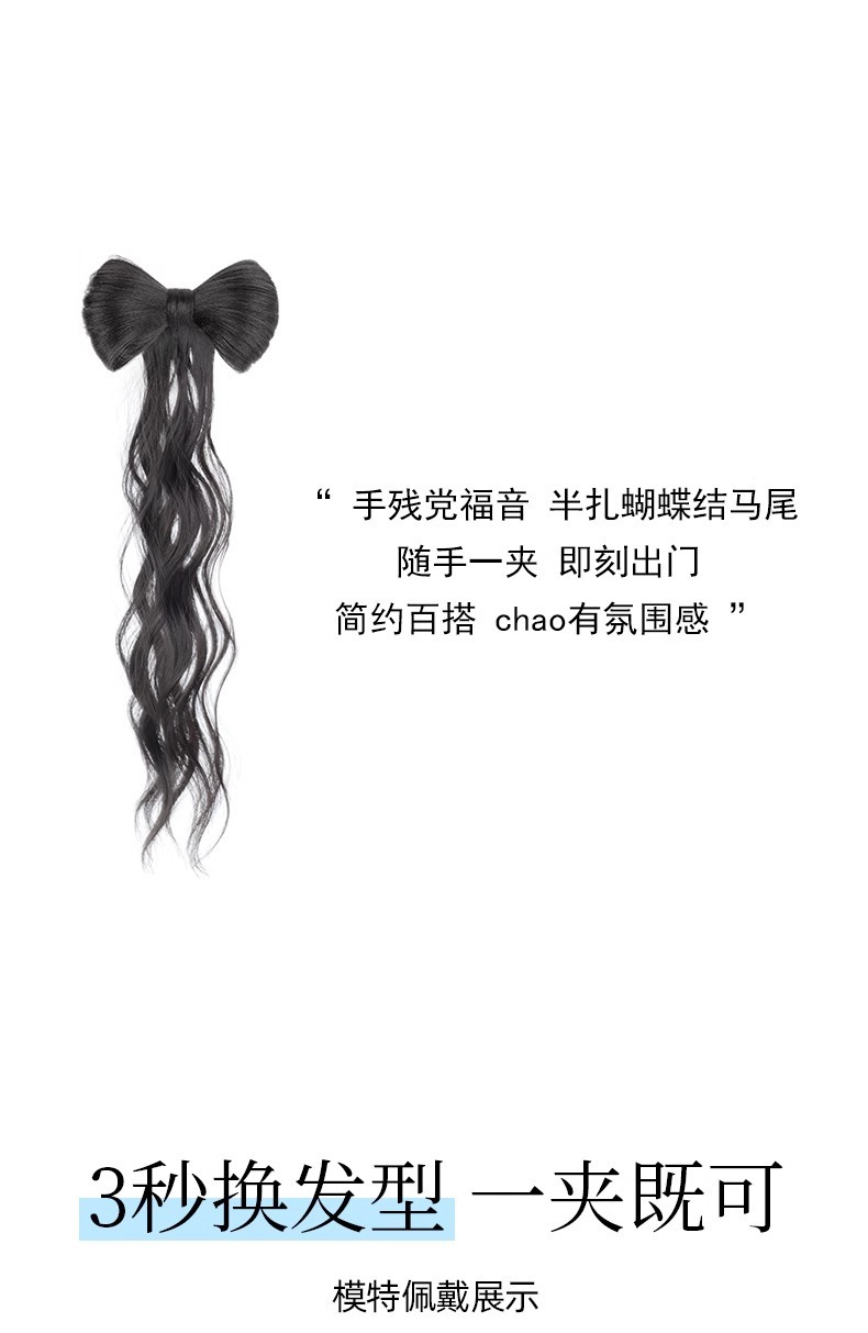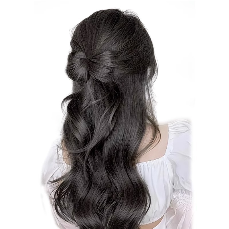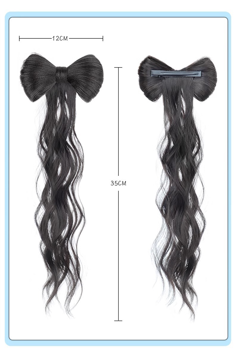 蝶結びのかつらの馬尾の女性は大きい波の低い馬尾の長い髪を挟みます。