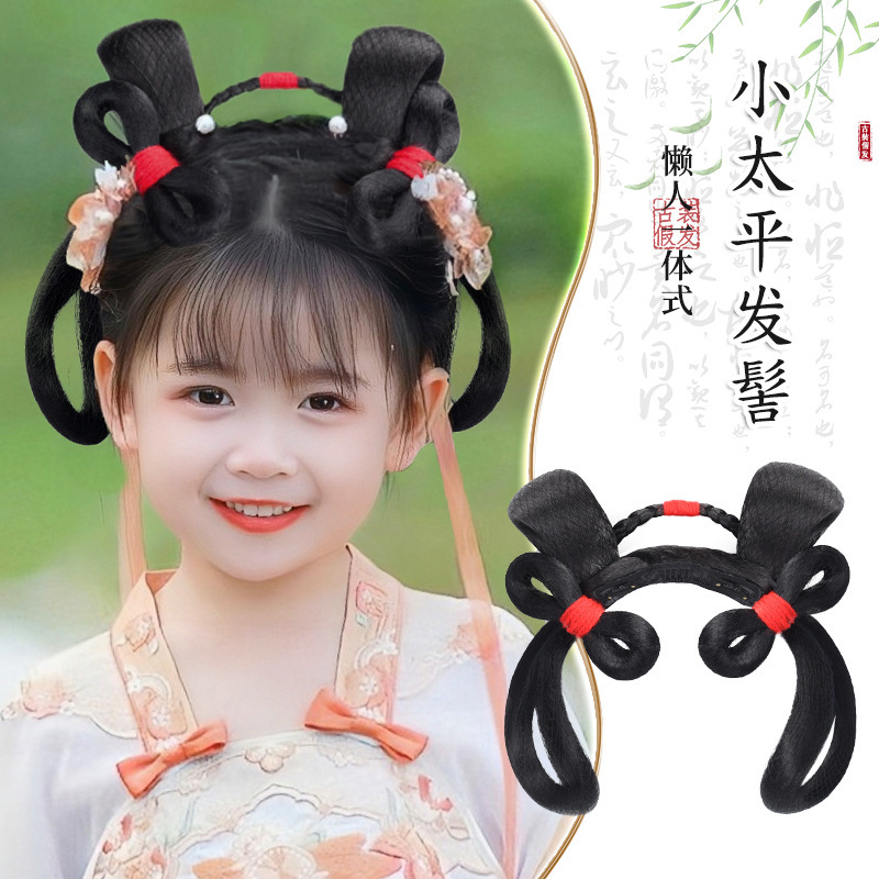 子供用古代風かつら、女の子用古代風漢服頭飾り、ヘアアクセサリー、ソフトおだんごかつら、唐、宋、明のオールインワン新作