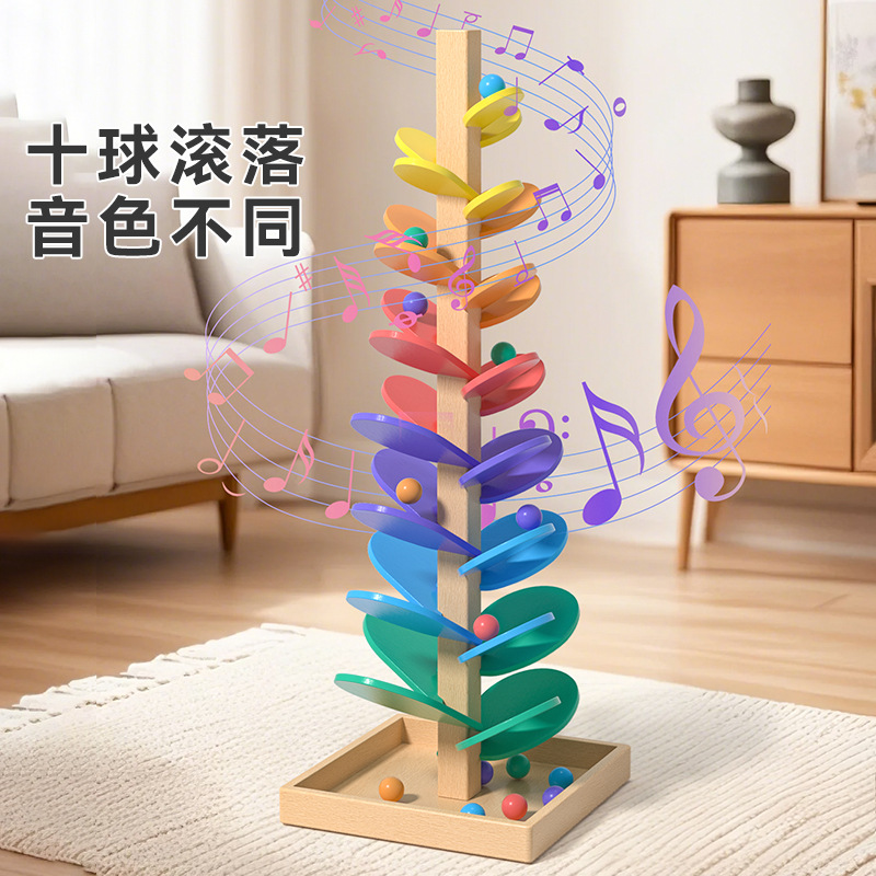 Ins音楽樹玩具実木質軌道ボール赤ちゃん啓蒙益智積み木虹色花びら知恵樹