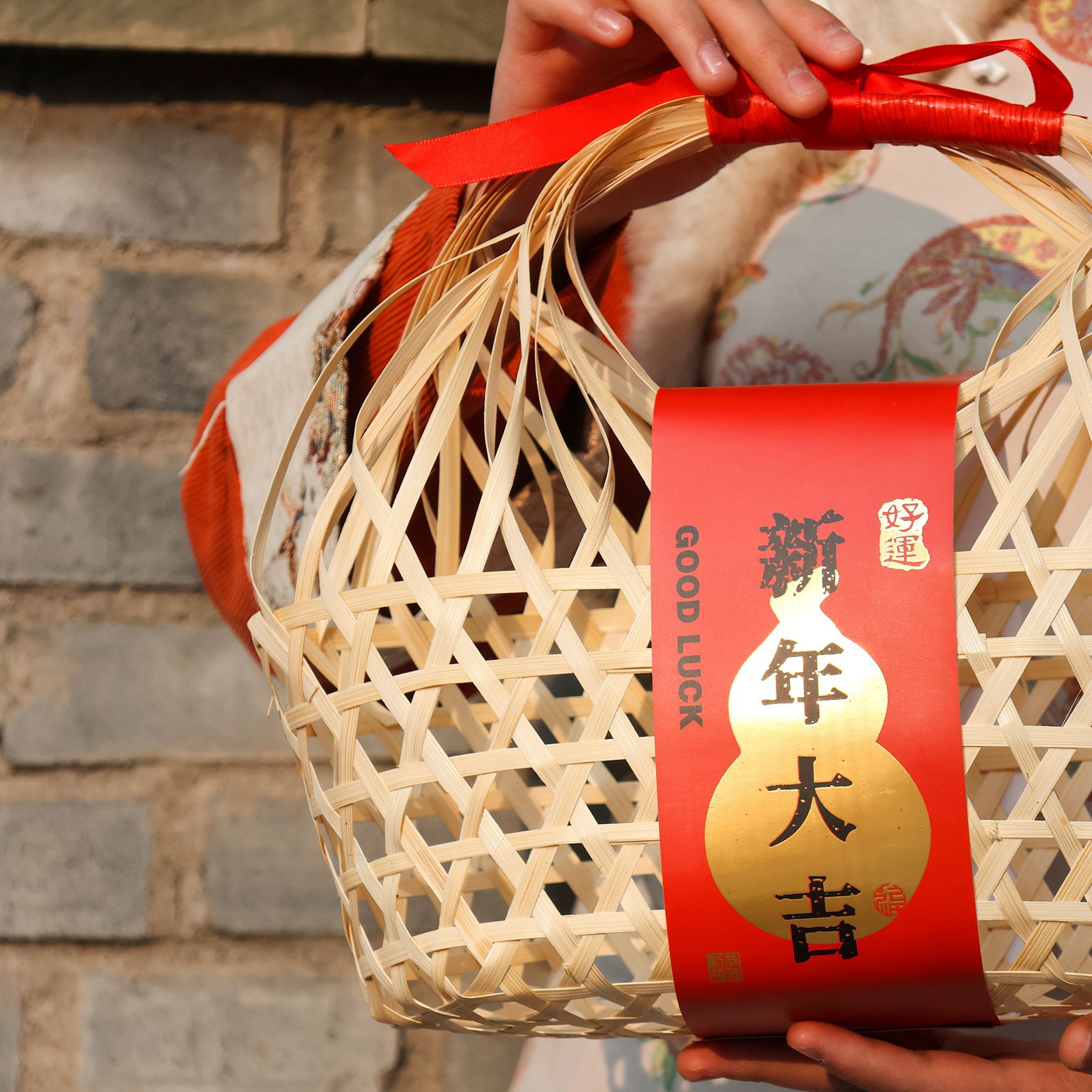 2026马年红色手提竹篓年货腊味特产礼品竹篮竹编春节送礼包装盒