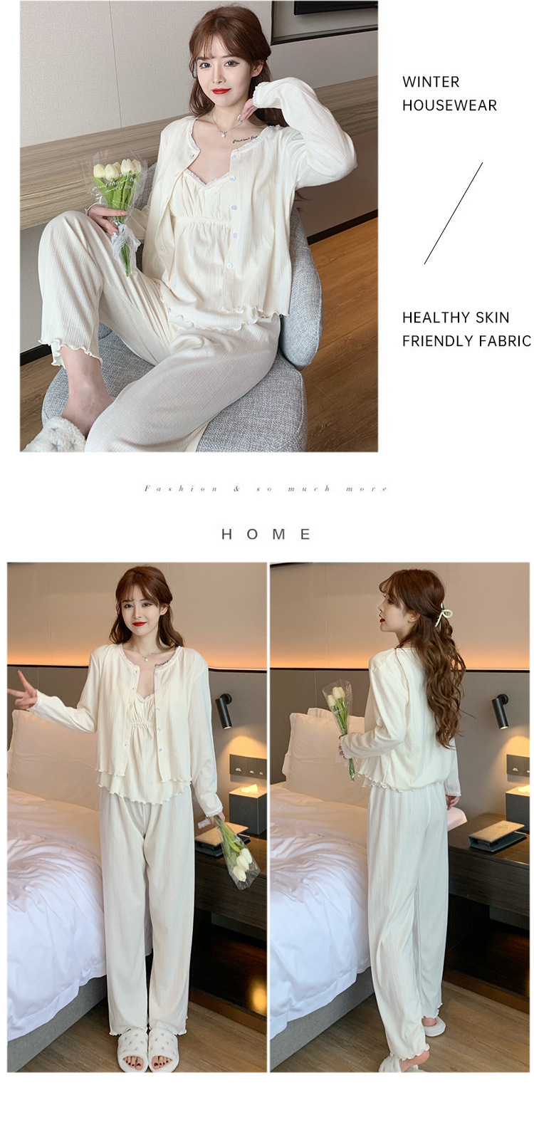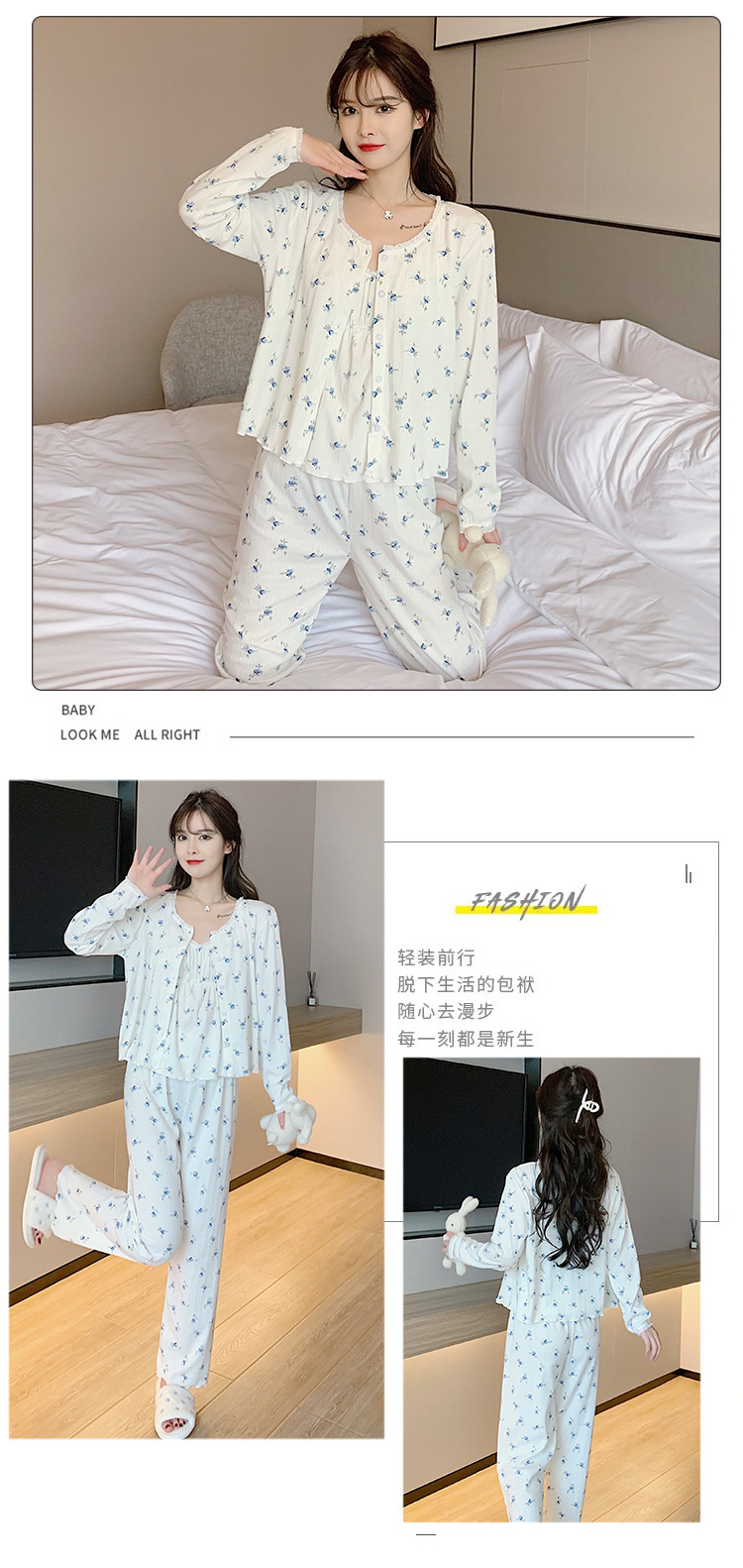 ロングパジャマ女性冬保温vネックカーディガン長袖長ズボン少女甘美小清新家庭服セット