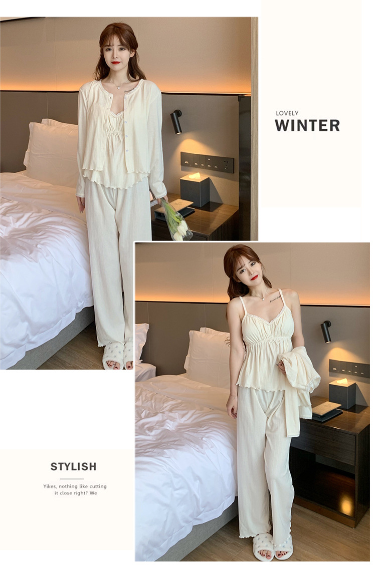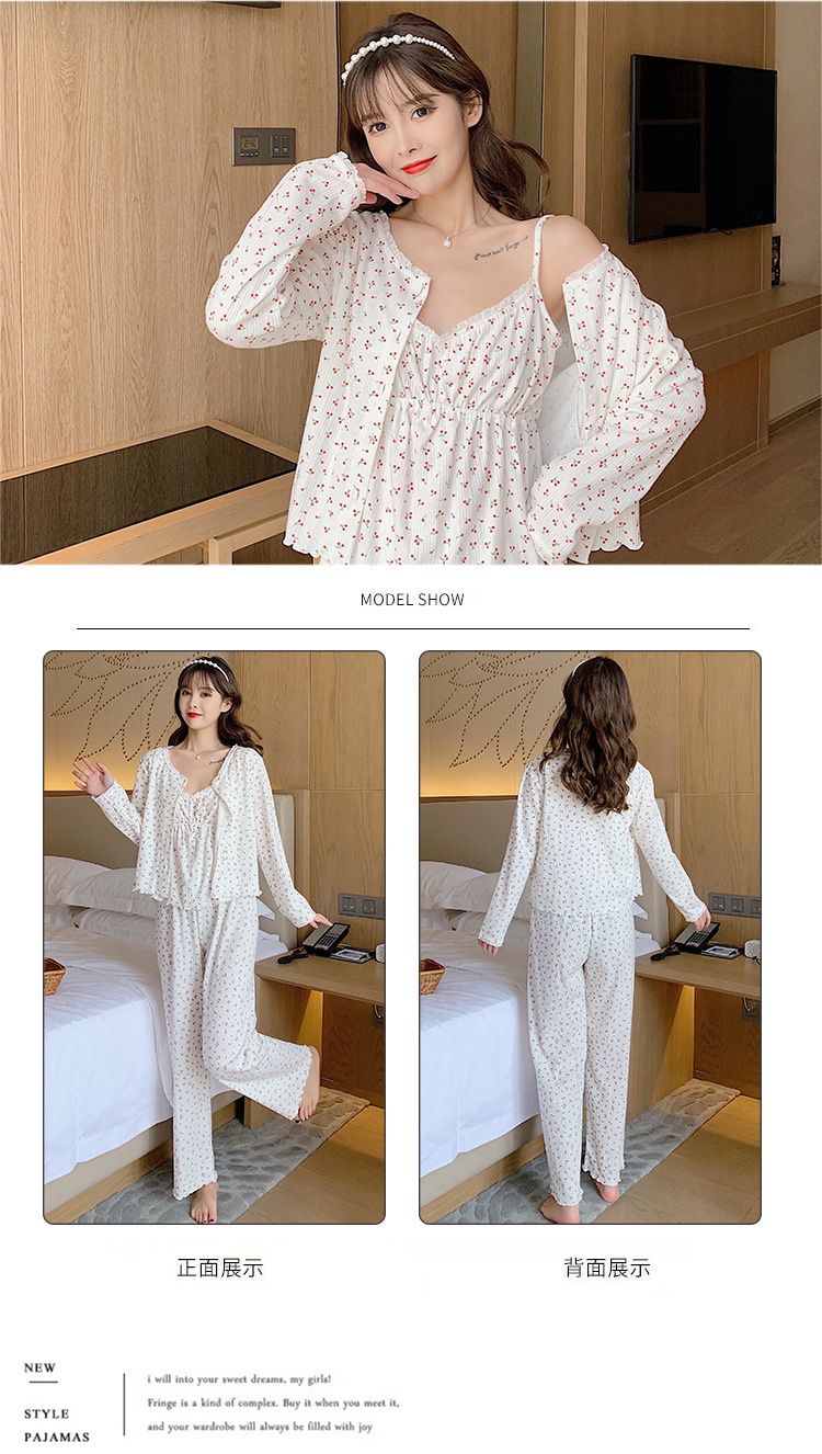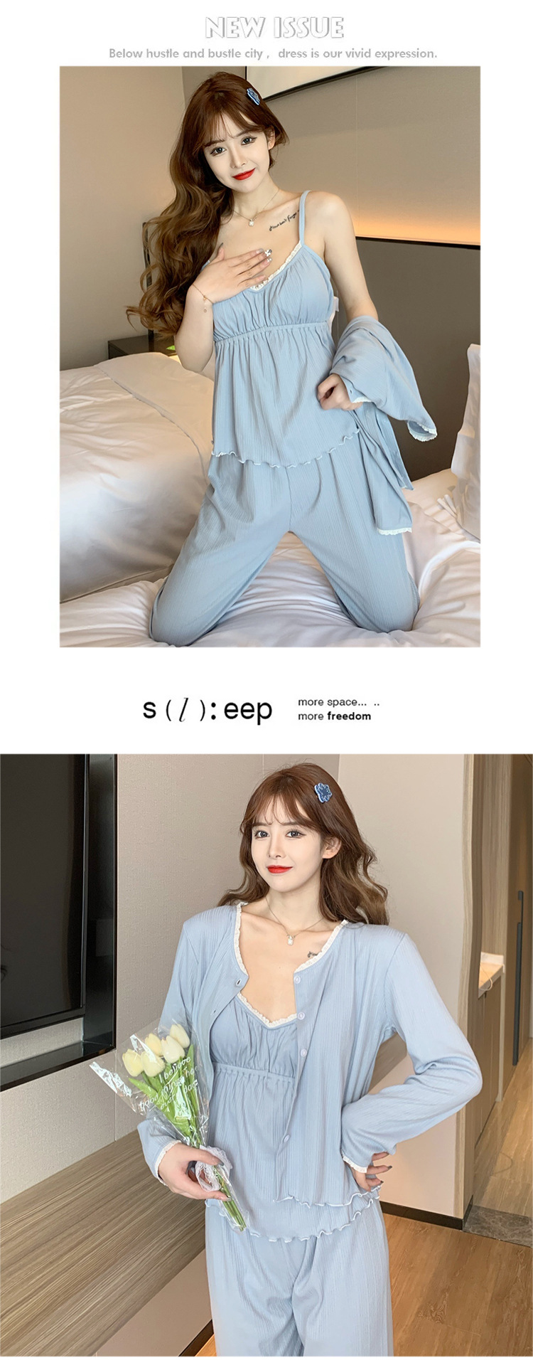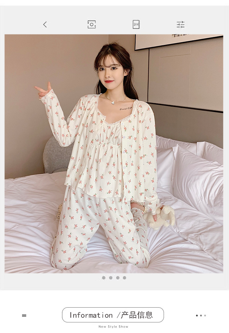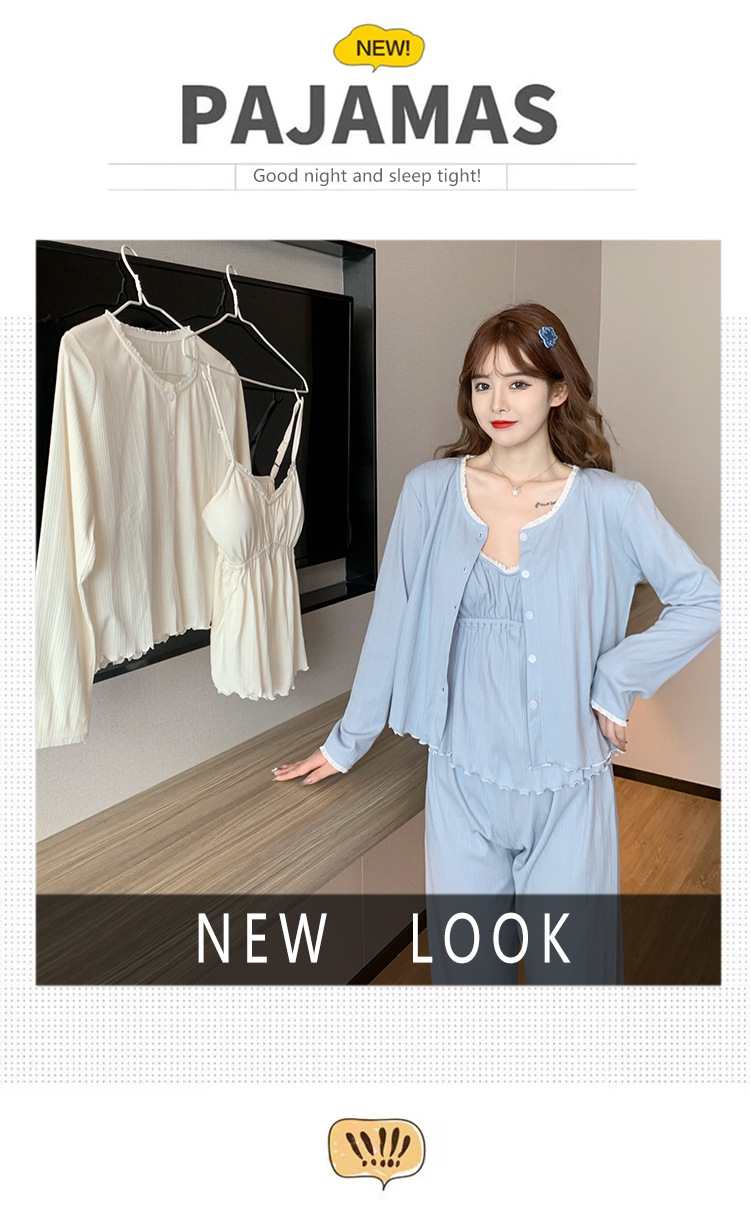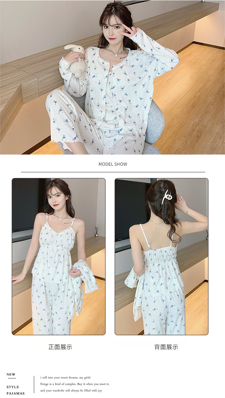 スリーピースパジャマレディース春と秋の新作6535コットン少女セクシーストラップロングパンツ胸パッド付きホームウェア薄い