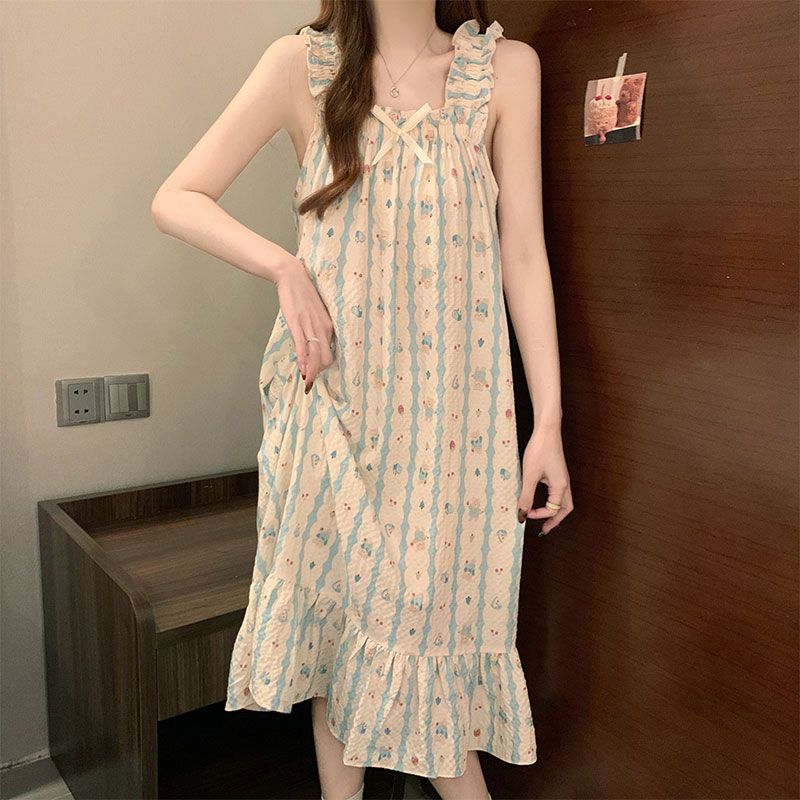 パジャマの女性の夏の新型の泡綿の袖なしのストラップの中で長い眠りのスカートの少女の甘くてかわいい家の服は外に着ることができます。