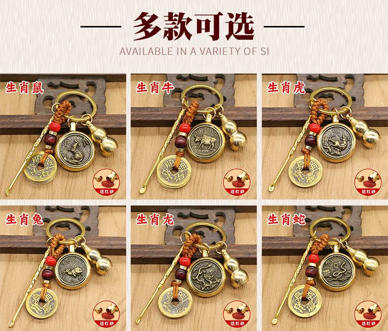 純粋な黄銅の五帝の銭の瓢箪の朱砂のピシュピストのペンダントの12年生肖はお金の車の鍵を回転します。
