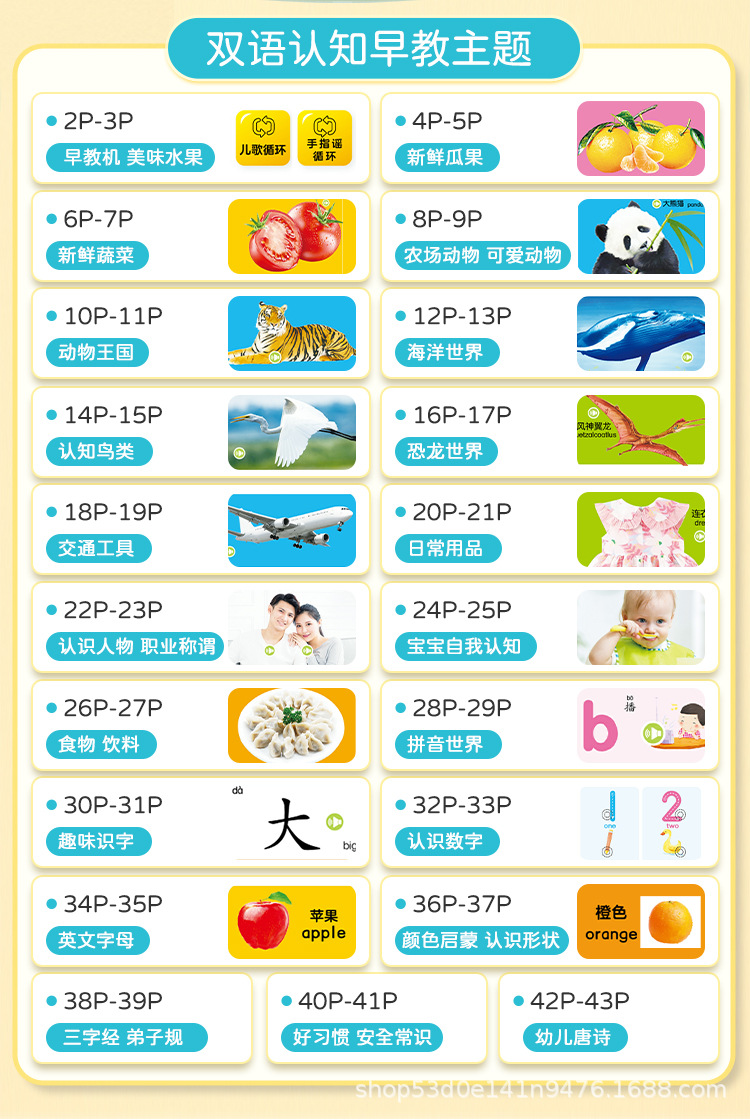 86A バイリンガル早期教育,36A 早期教育教室,27A 赤ちゃんが話すことを学ぶ,16A解説版早期教育ブック,04B ベビーサウンドブック,05B 黄色の早期教育