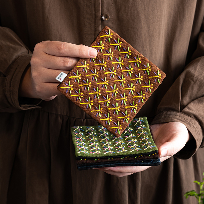 复古刺子绣手缝蜻蜓杯垫扎染帆布禅意杯垫布艺壶垫隔热垫茶道配件
