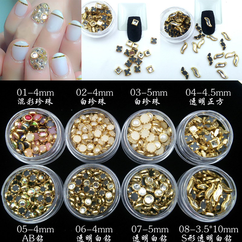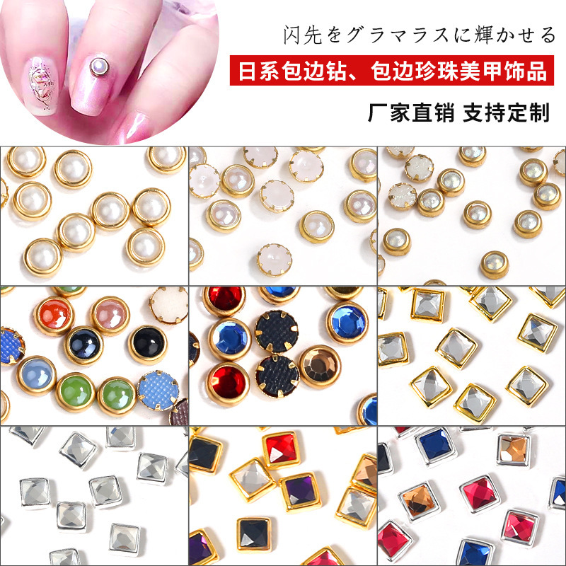 日系美甲金属包边珍珠宝石美甲平底钻透明幻彩亮钻方形指甲钻饰品