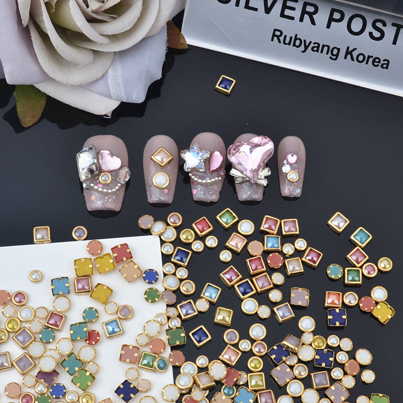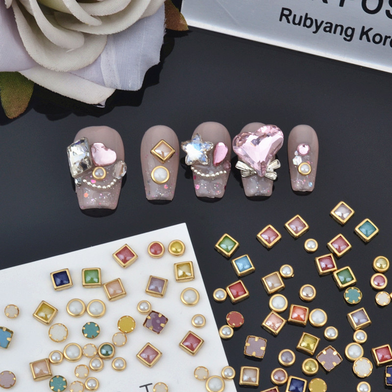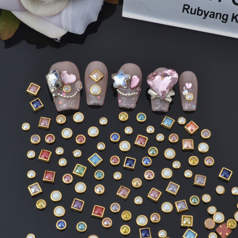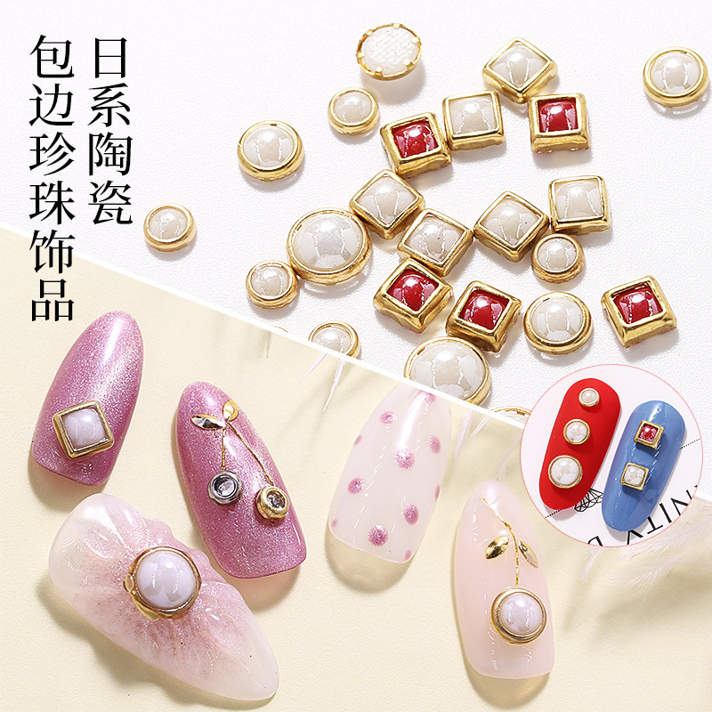 日系陶磁器縁真珠ネイルアクセサリー卸売り金色リベット白色円形方形平底爪装飾