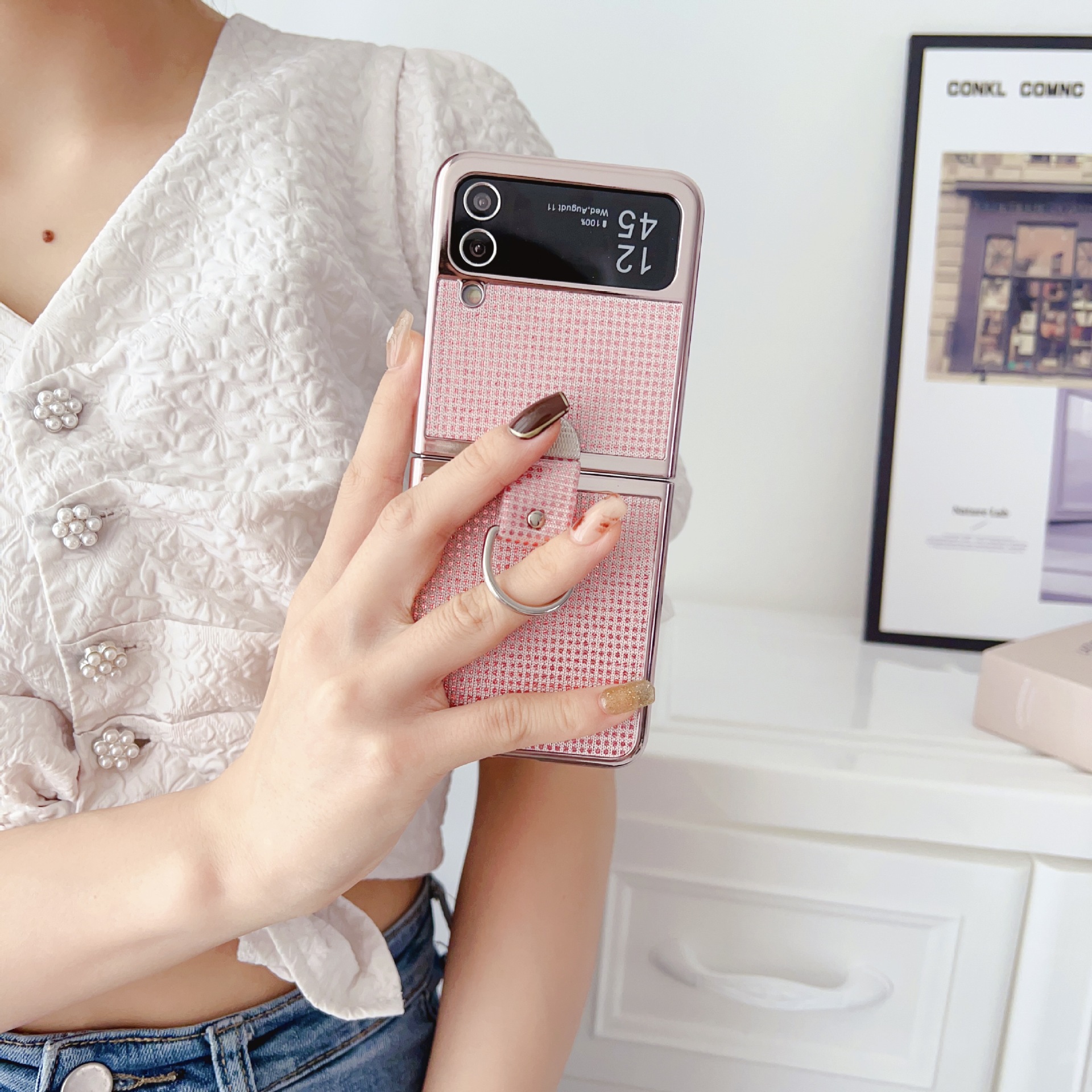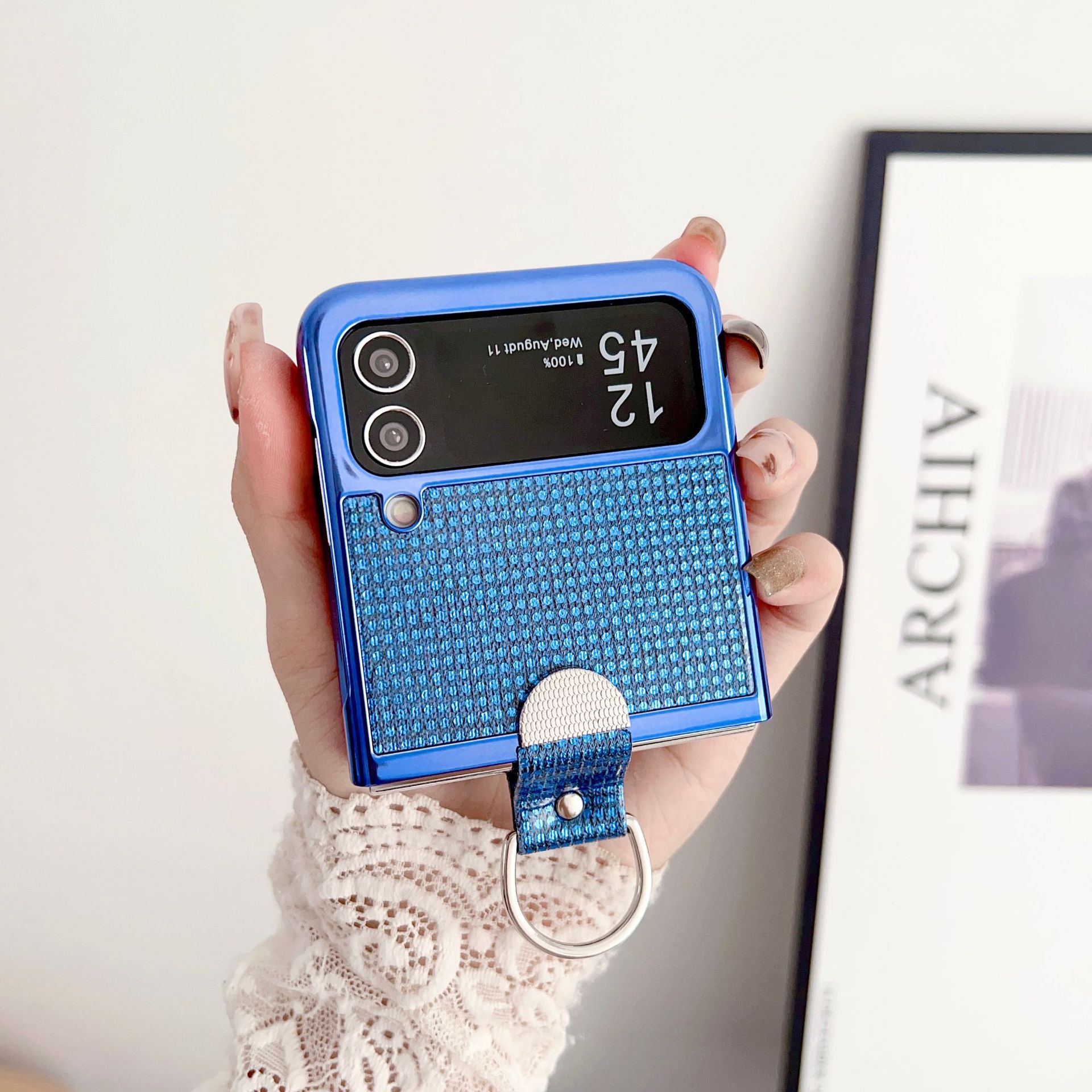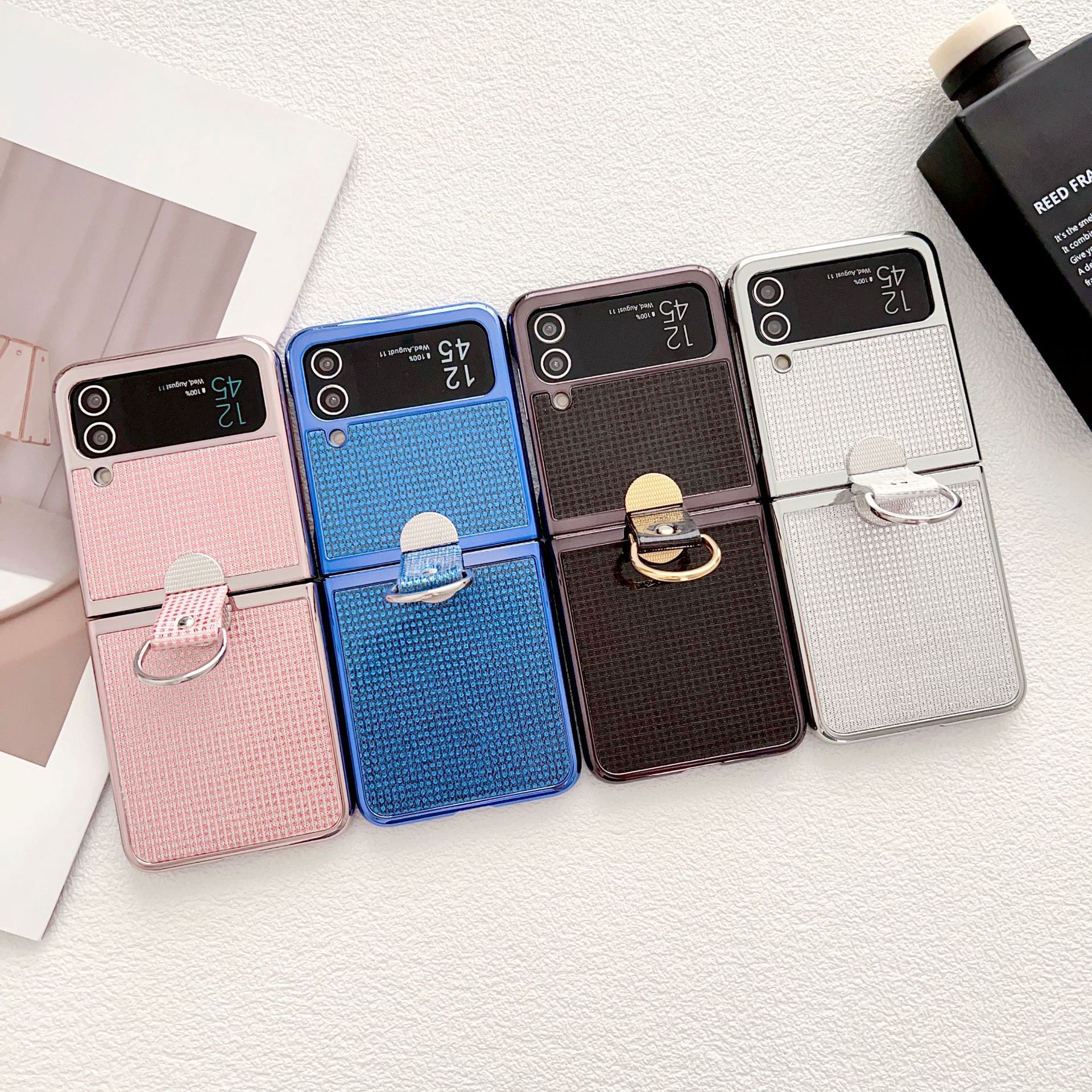 サムスンz flip3携帯ケース折り畳みスクリーン携帯ケースpuフラッシュパウダー創意指リングバックルflip4保護カバーを適用します。