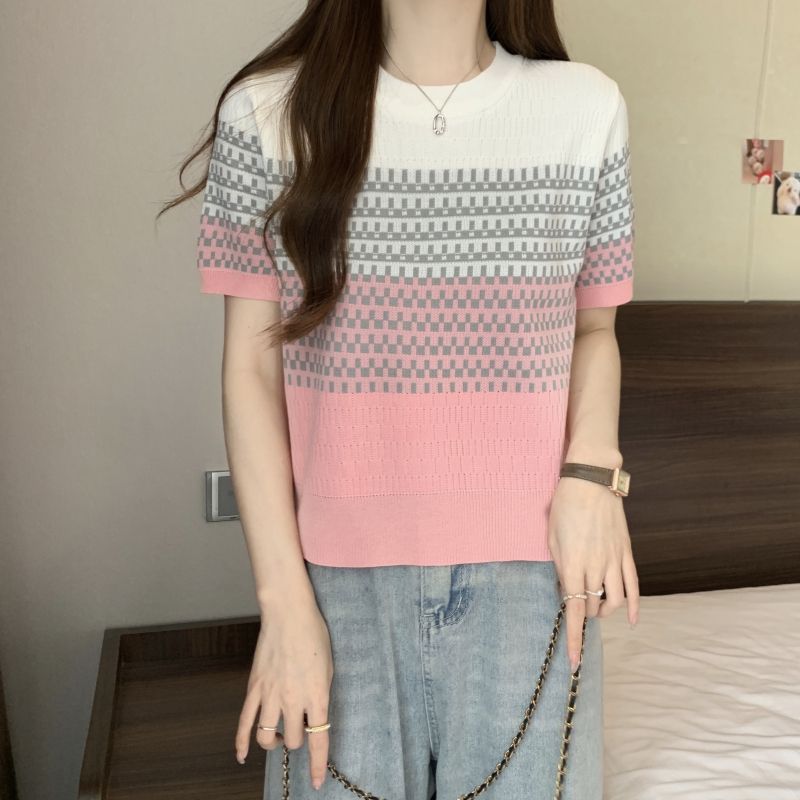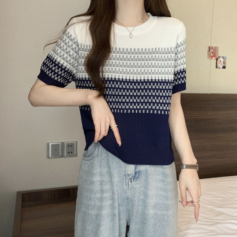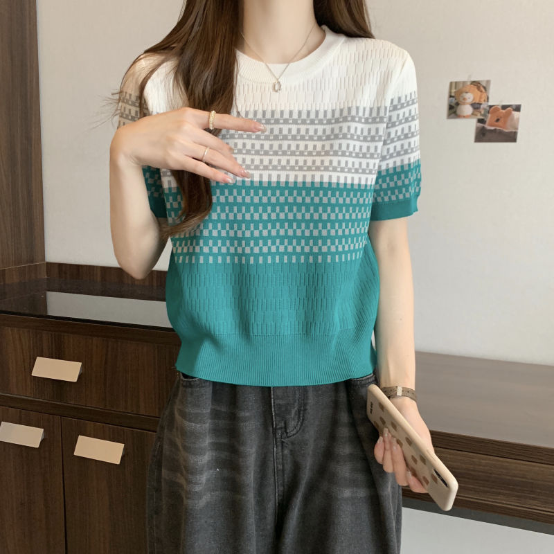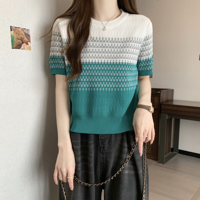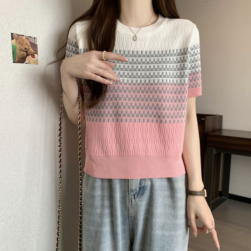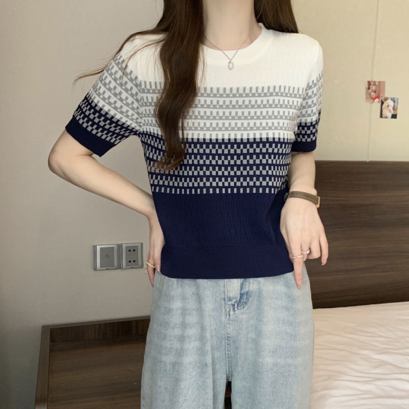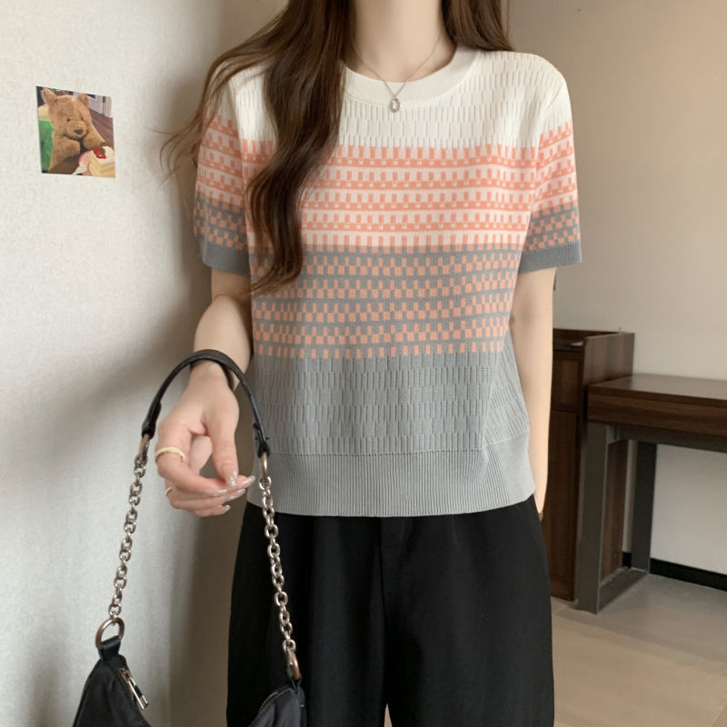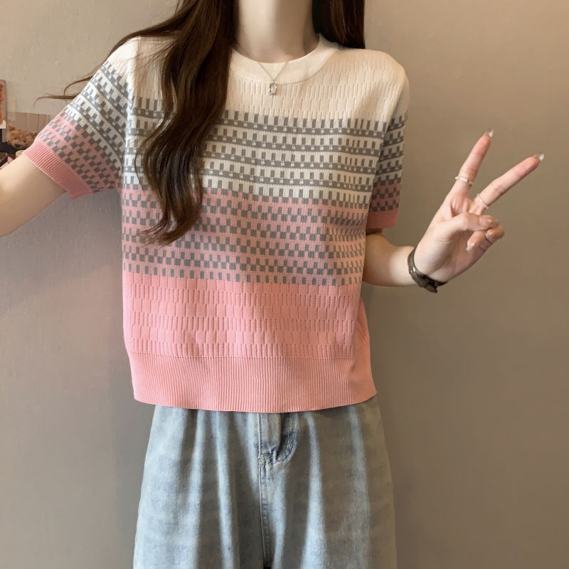 2025年夏新作 レトログラデーションストライプ半袖Tシャツ おしゃれなアイスシルクニット 着痩せ効果のある個性的なトップス レディース