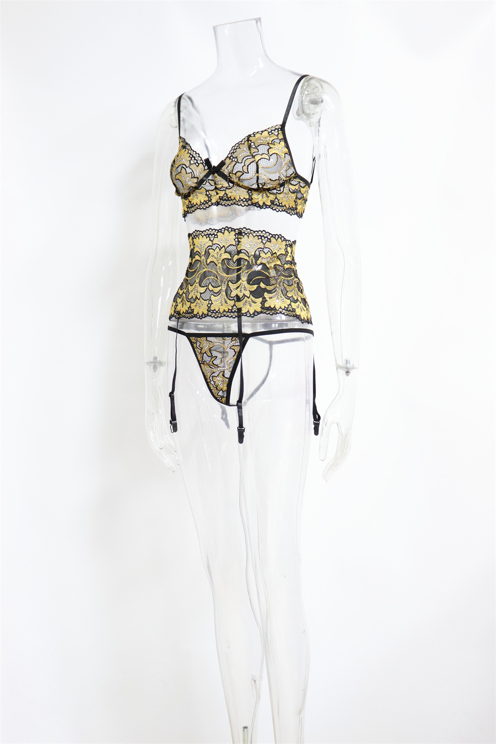 2025 ヨーロッパとアメリカの新しいフレンチプリントスプリットセクシーランジェリーシースルーサスペンダービキニブラセット