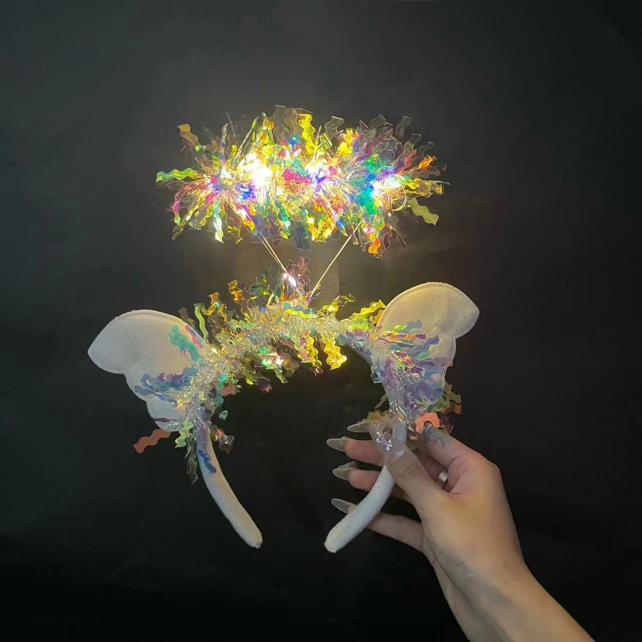 金糸の天使のヘアバンド、光るヘッドドレス、羽根の天使の羽のヘアバンド、夜市での商品、花輪、光る