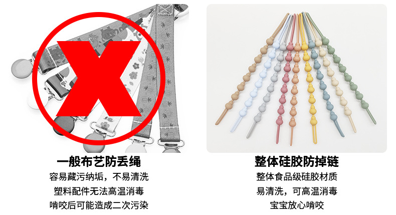 国境を越えて起爆した赤ちゃんがおしゃぶりをなだめると、赤ちゃんが鎖を落とさないようにするゴムチェーン一体式食品級シリカゲルが水で煮ることができる