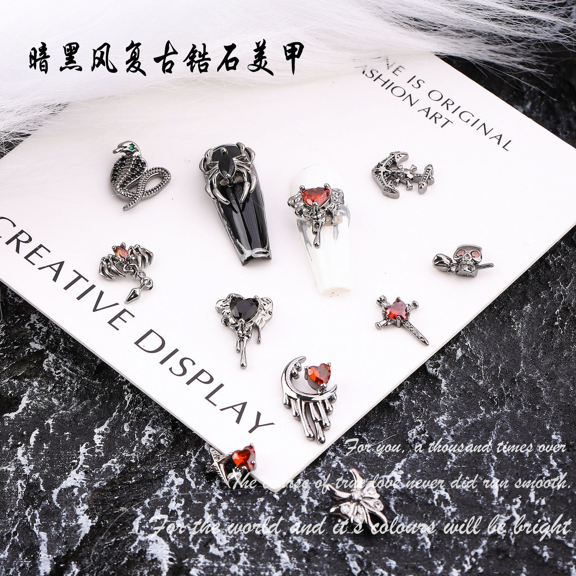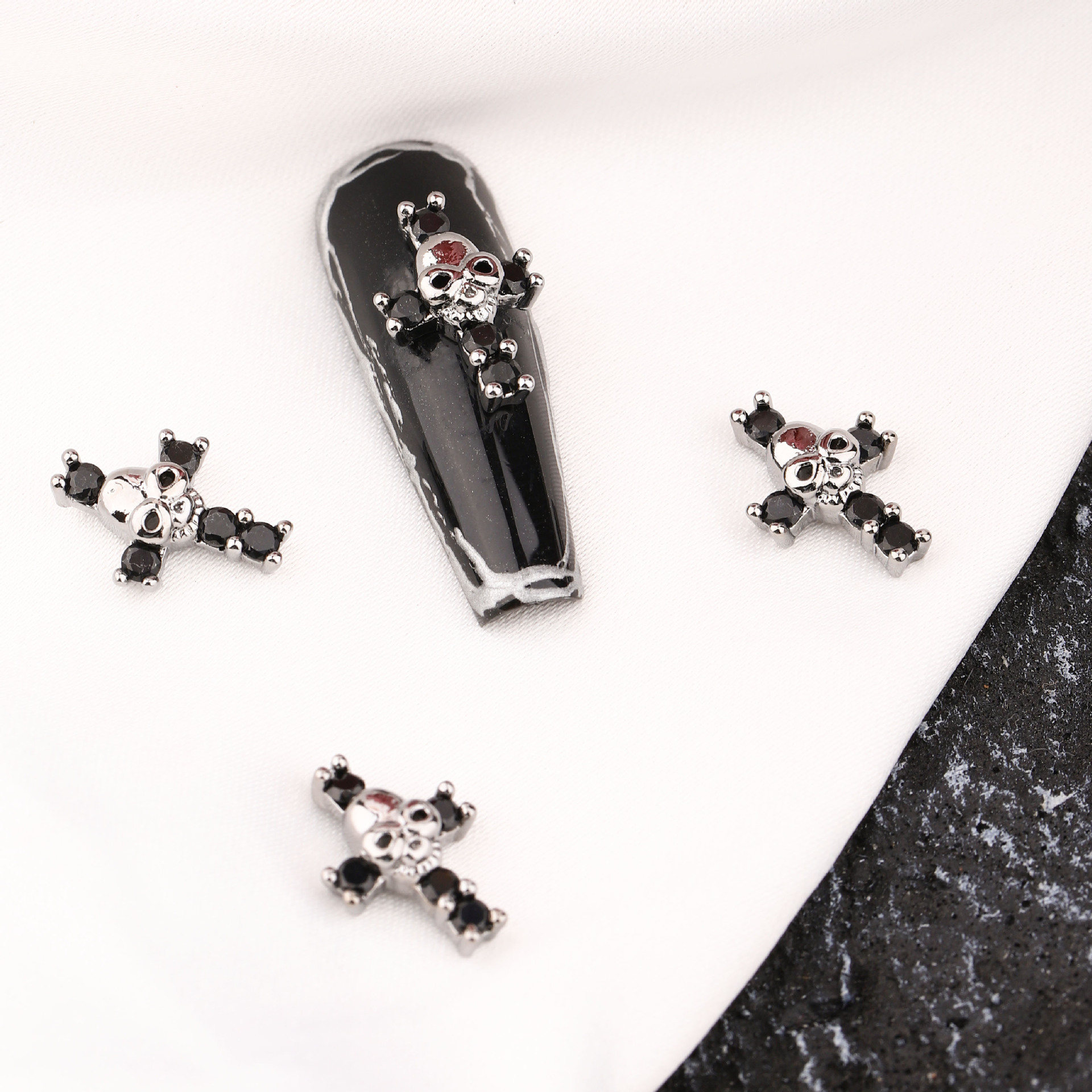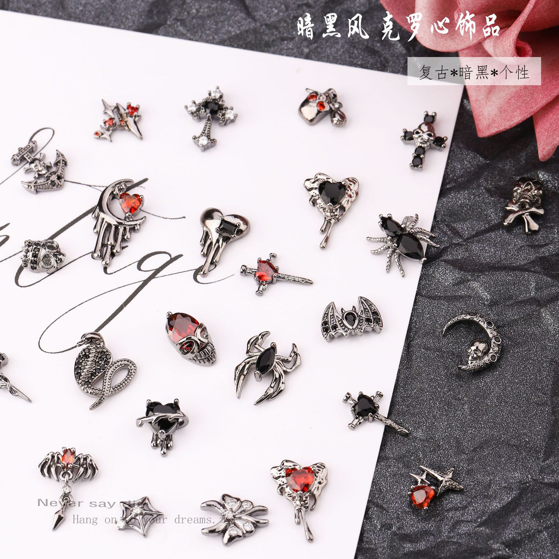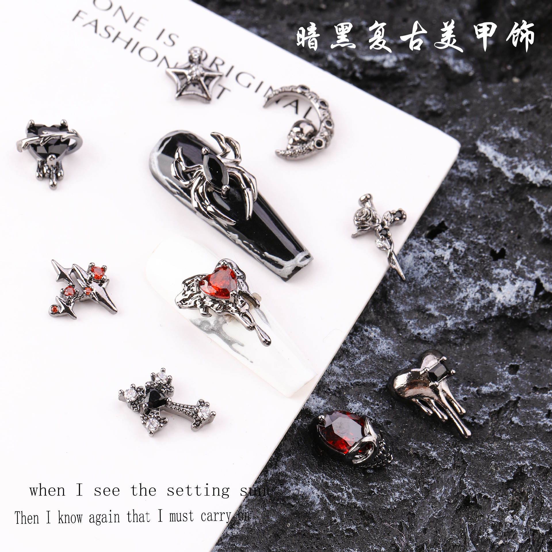 ハロウィンネイルアート クロウハート レトロクロス メタル銅製ジルコンハート スカルネイル ウェアラブルネイルアクセサリー