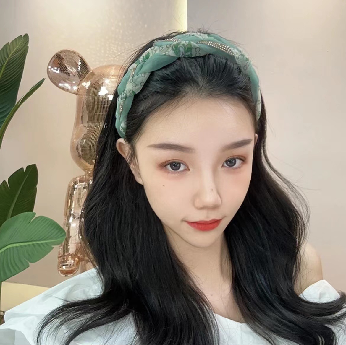 カチューシャの女性が顔を洗っています。シンプルな髪の広いカチューシャです。