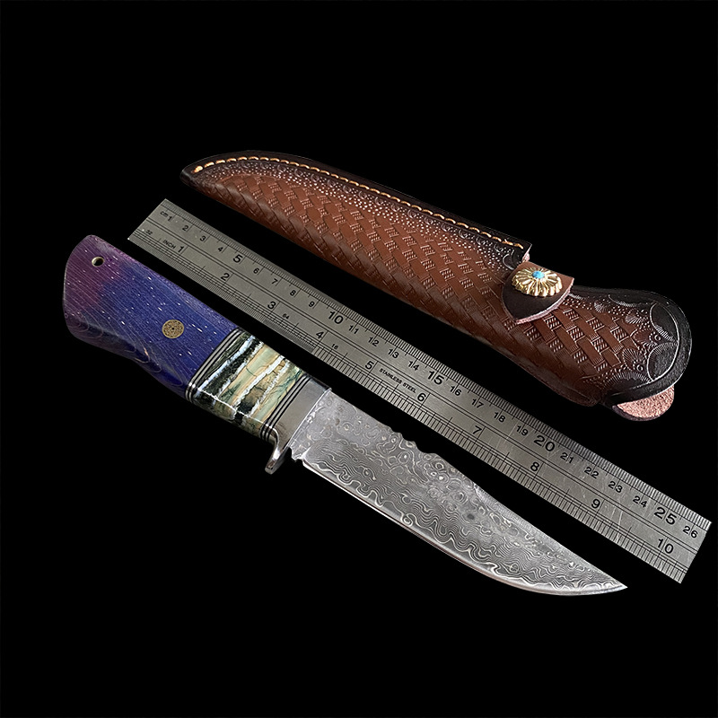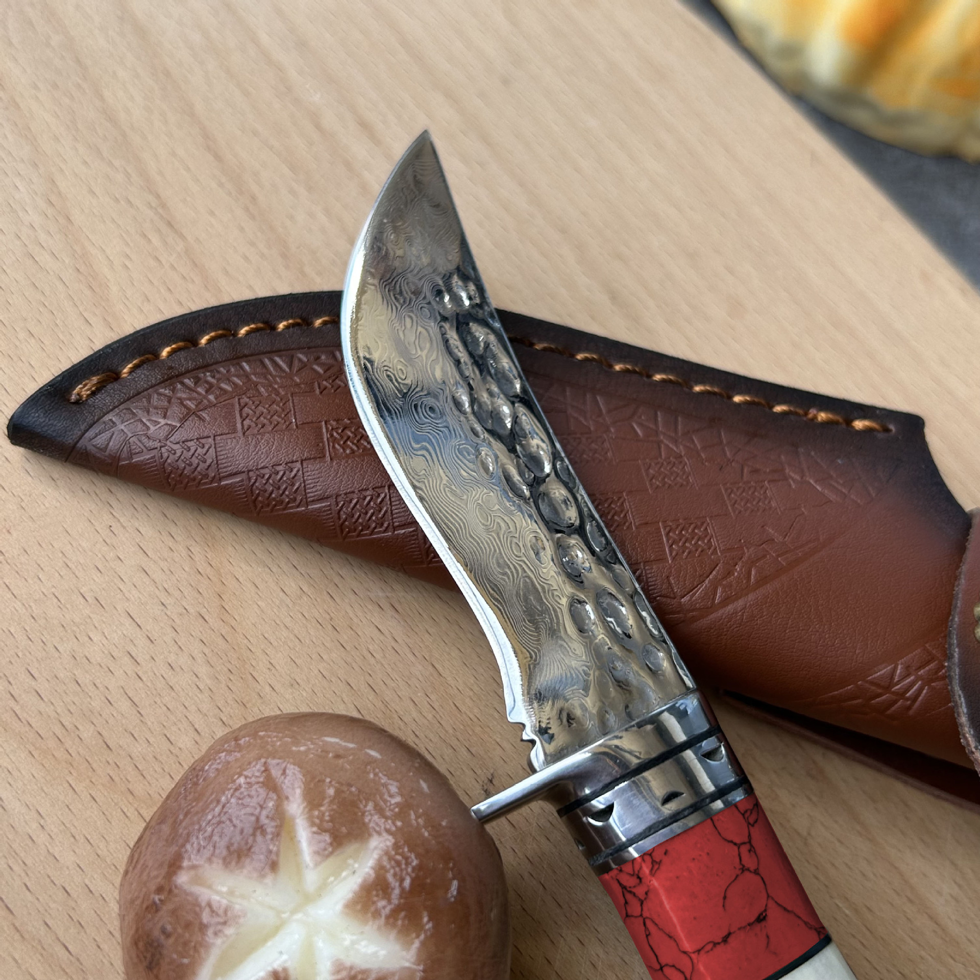 ナイフ フルーツナイフ 刀具 金属製 染色牛骨ハンドル ダマスカス鋼刃材 245g シース付き