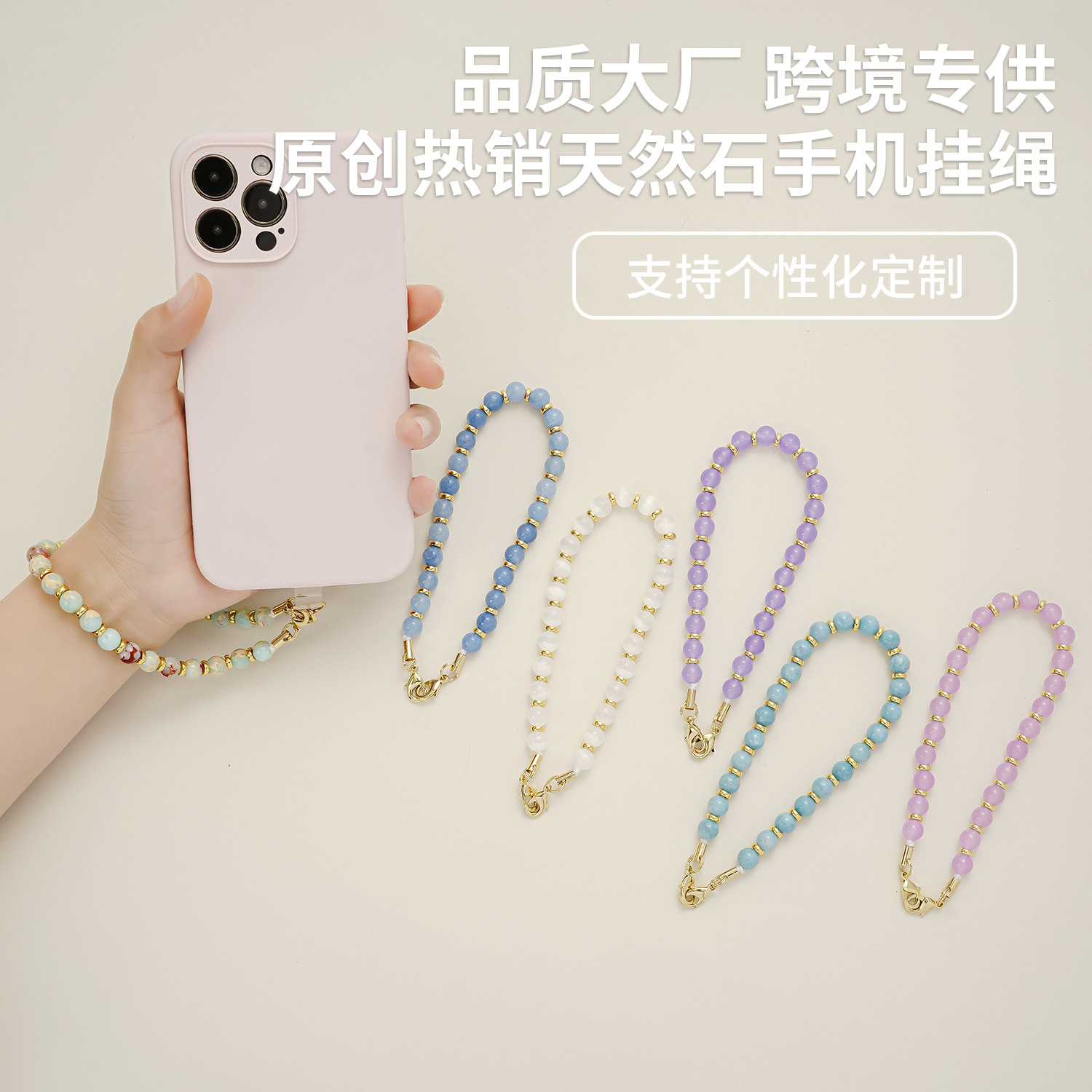 跨境热销天然石串珠手机链粉斑马黑曜石亚马逊石男女防丢失手链女