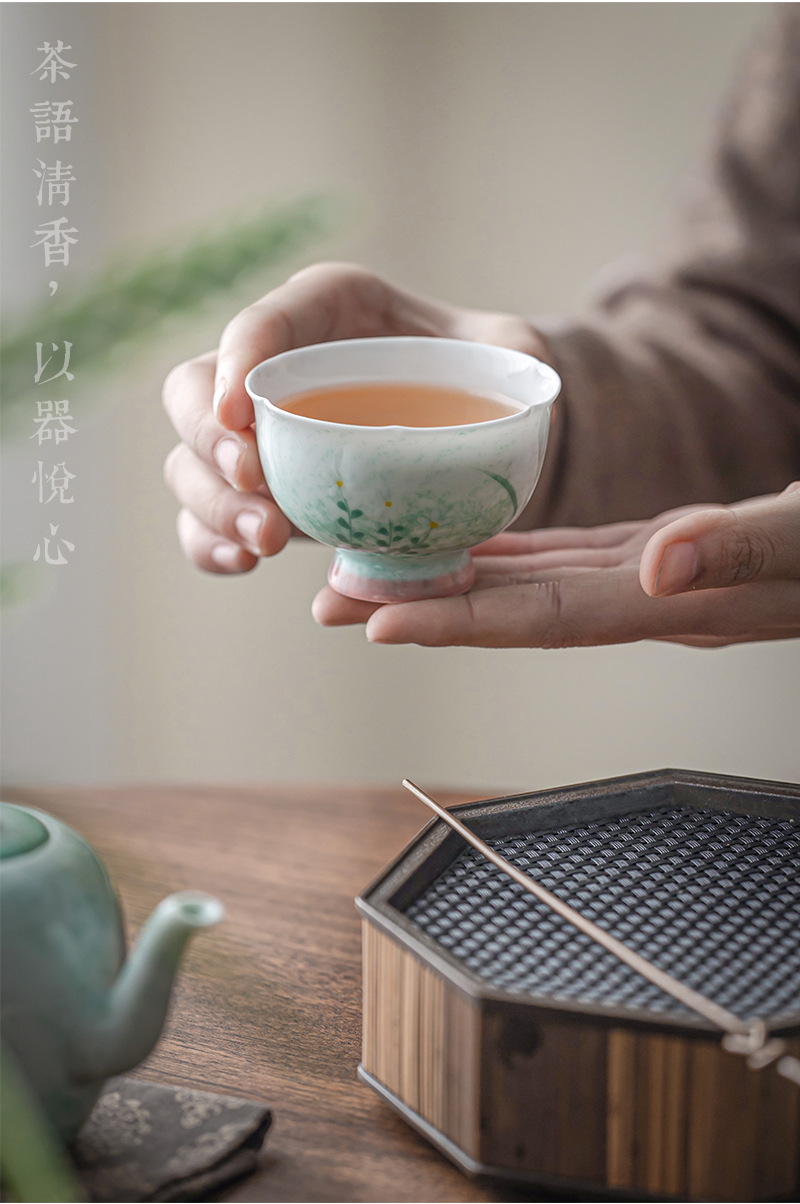 高颜值柠黄手绘桂花斗笠杯茶杯陶瓷釉下彩主人杯女士喝茶品茗杯