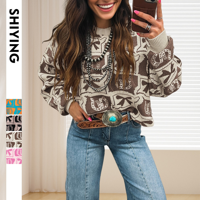 时颖复古格纹毛衣女士宽松套头衫长袖针织衫高弹上衣欧美跨境新款