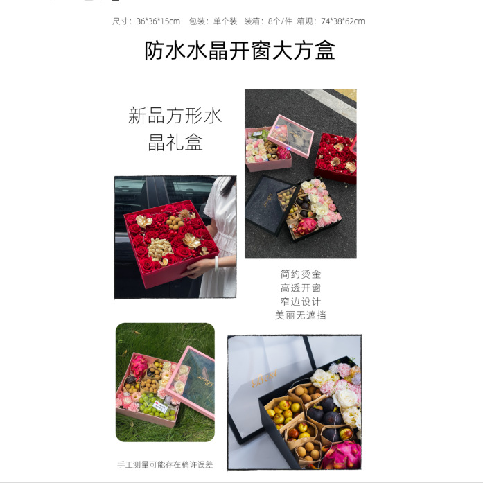 透明な正方形の花箱、ボーイフレンド用の香りの花の花束ギフトボックス、永遠の花のフラワーアレンジメントボックス、高級フルーツボックス卸売