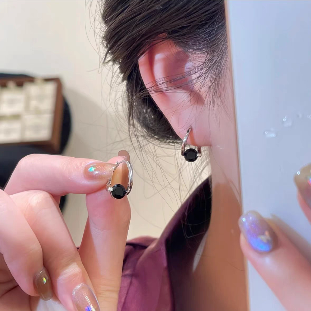 银黑色水晶耳扣耳环气质小众设计时尚耳饰个性百搭抖音热卖爆款女