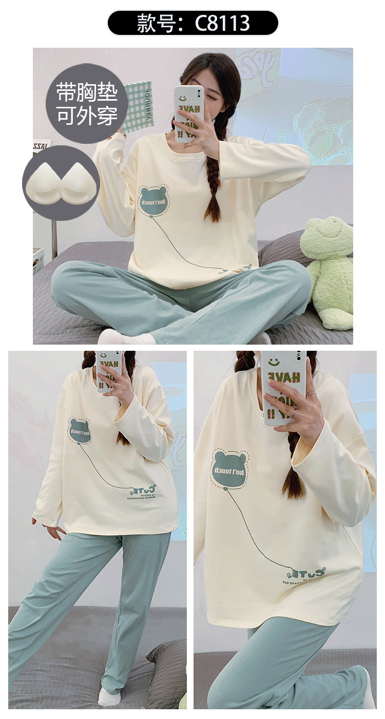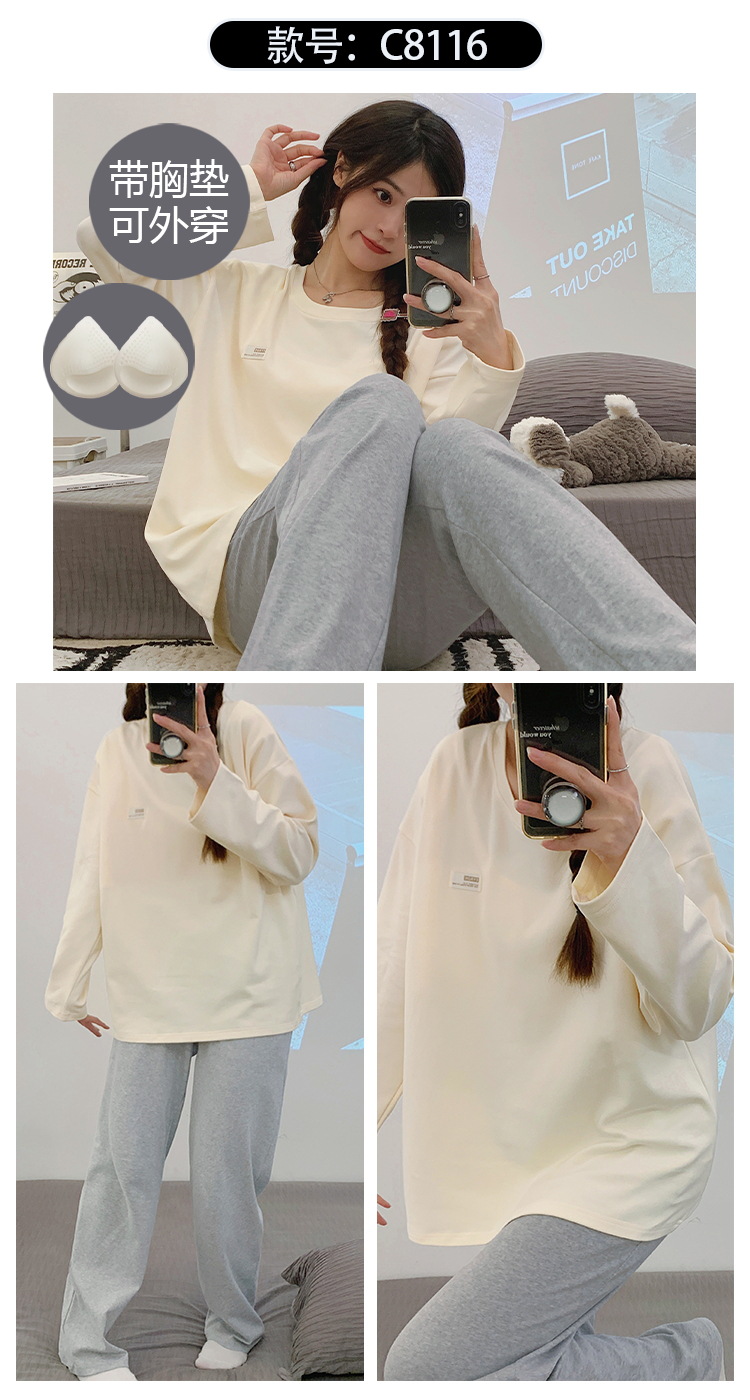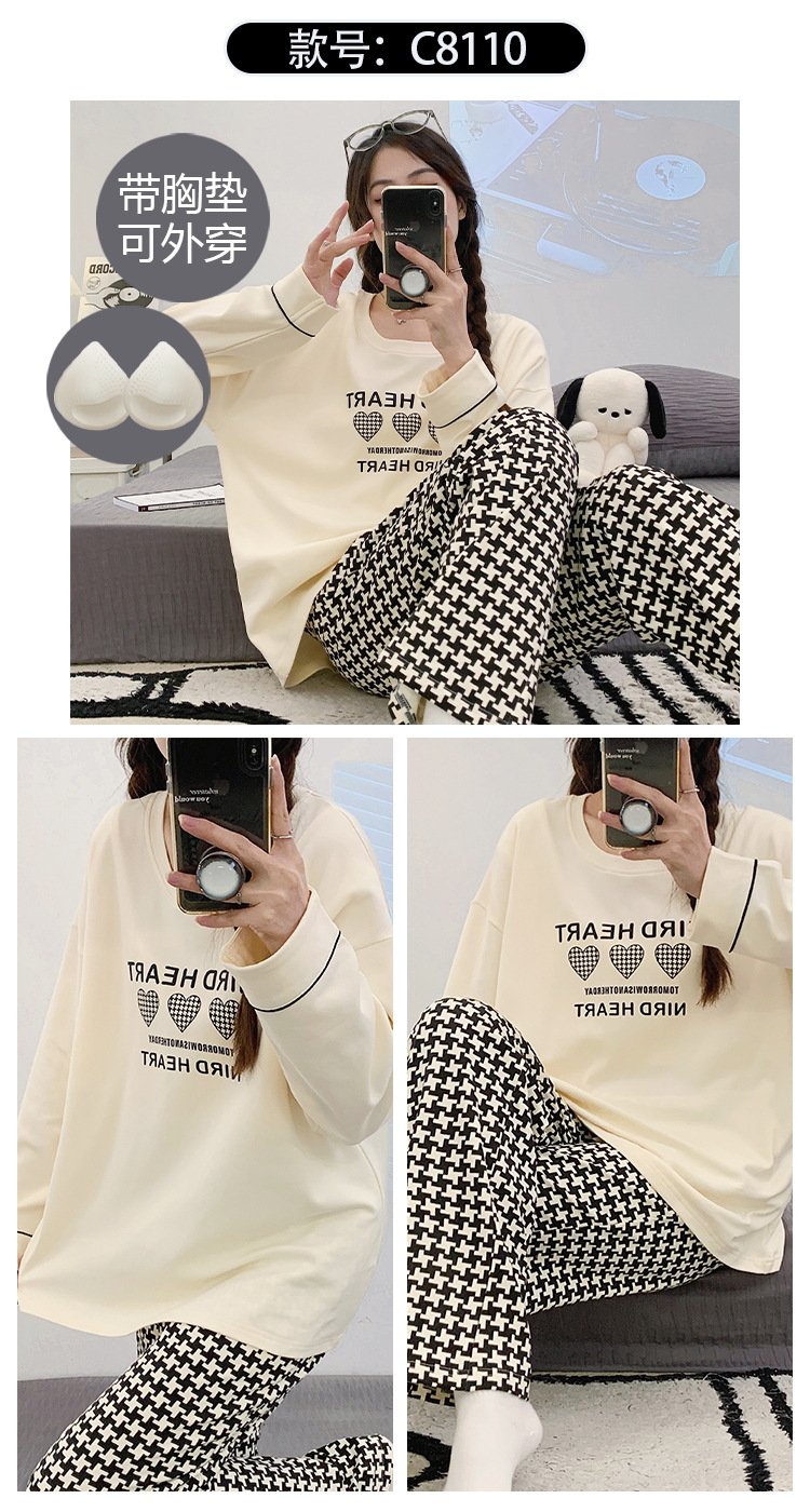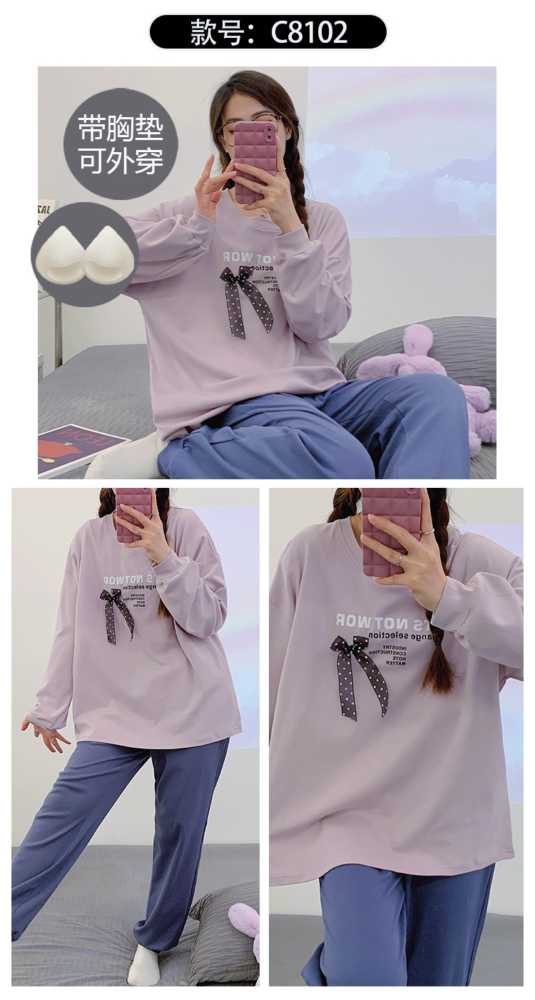 秋の新型長袖純綿パジャマ女性のカジュアルサイズは、綿の家庭服セットを着て生放送することができます。