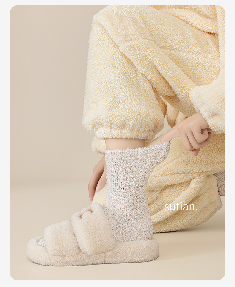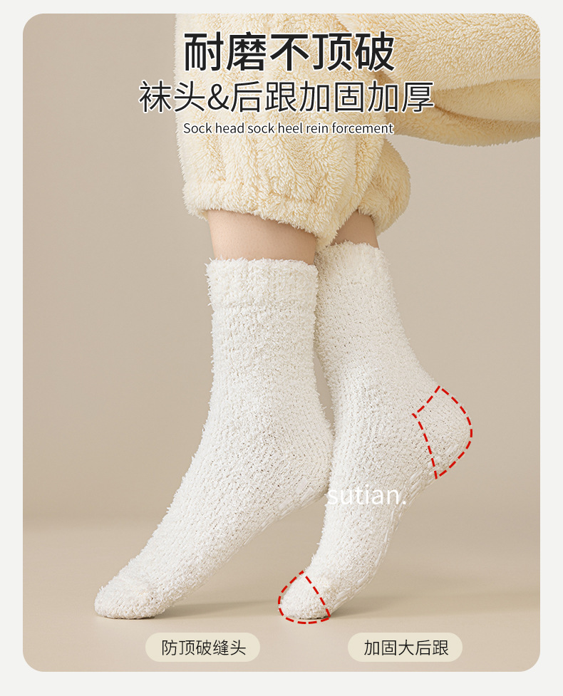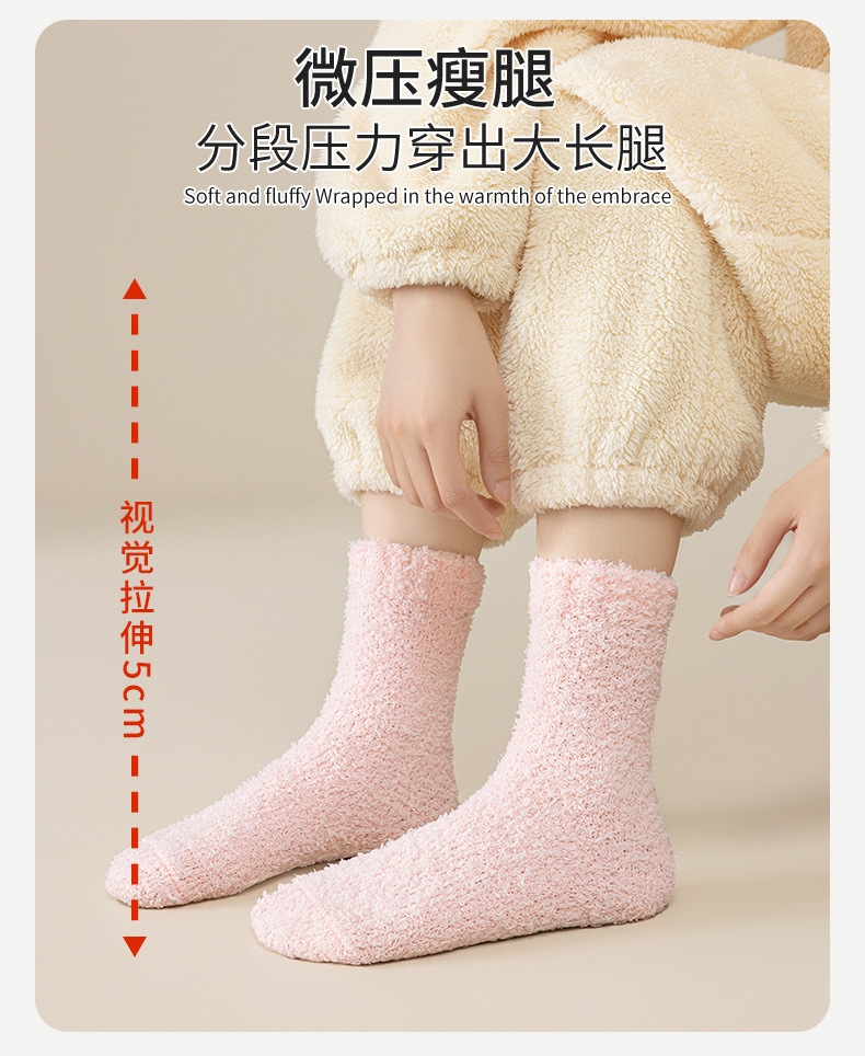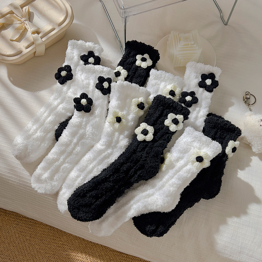 珊瑚绒睡眠袜子女冬季加绒保暖中筒袜女士加厚防寒居家月子袜花朵