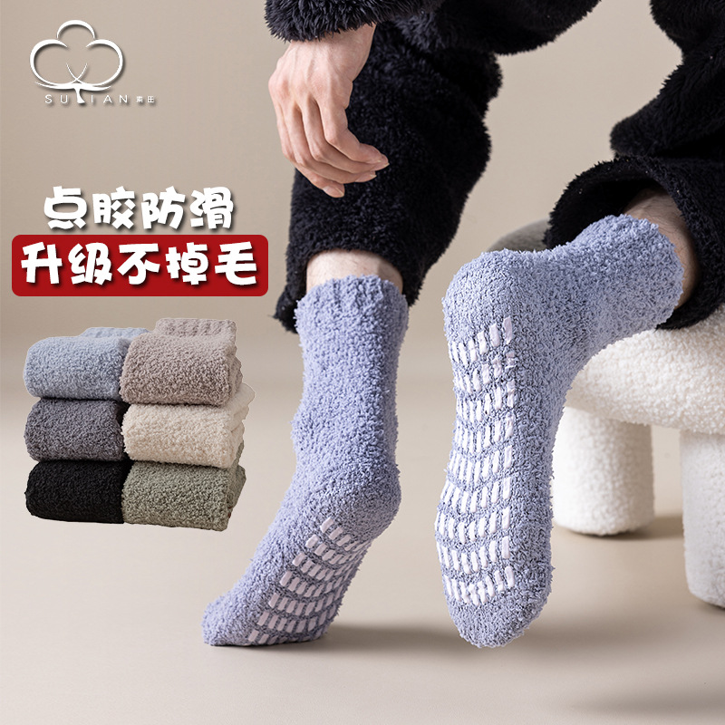 珊瑚绒袜子男中筒秋冬季保暖地板袜防滑加绒加厚毛圈睡眠袜冬天