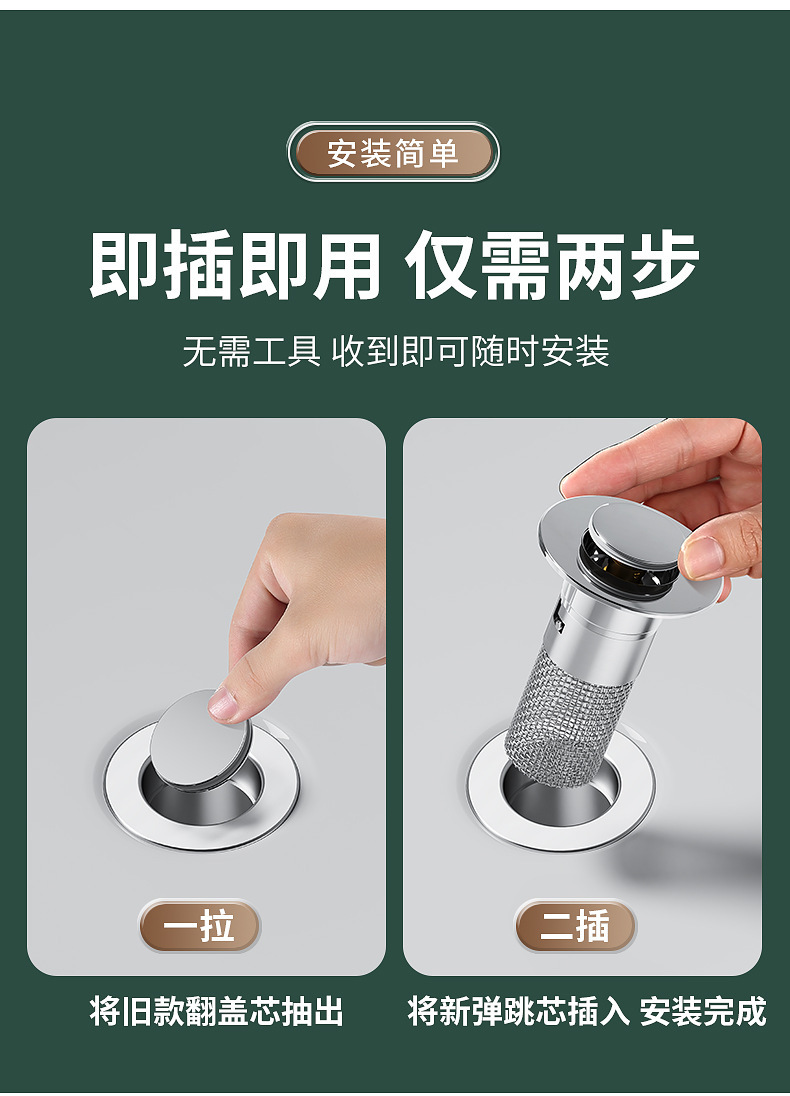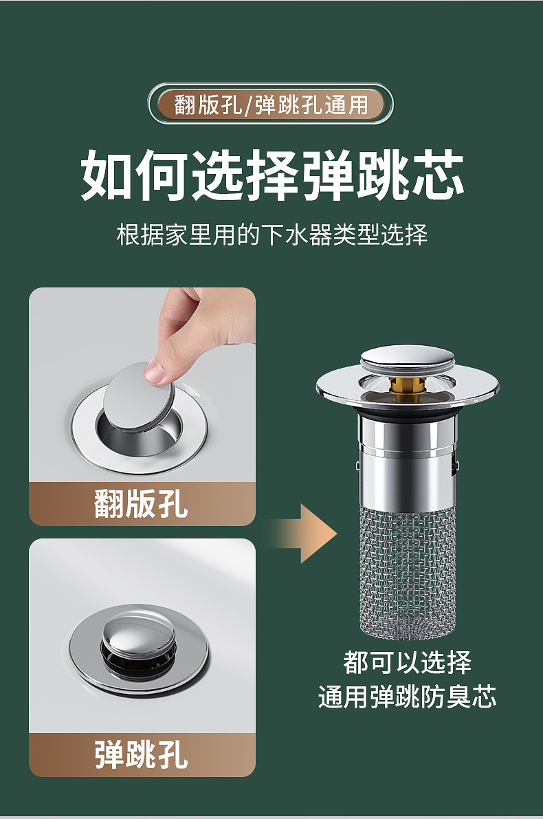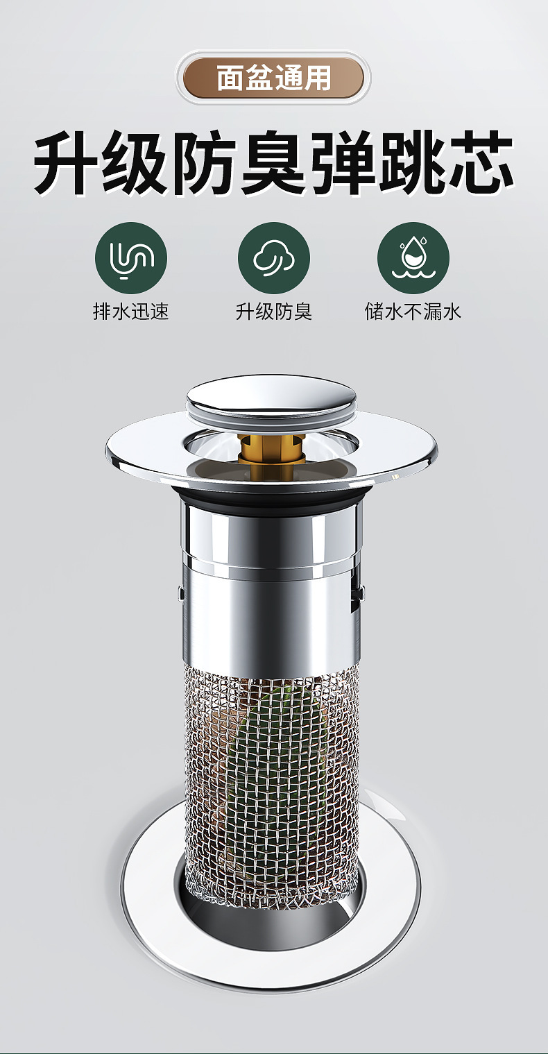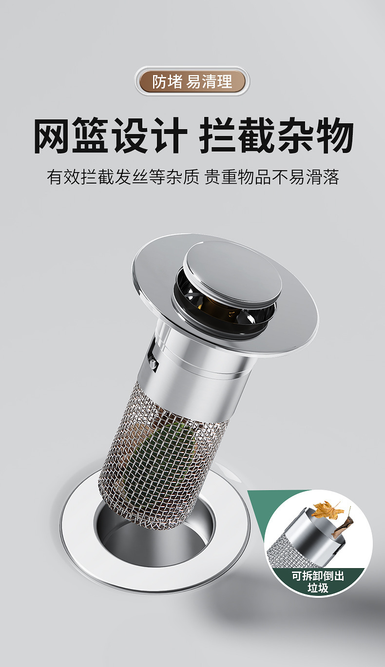 面盆洗手盆通用弹跳芯304不锈钢防臭堵孔塞洗脸盆按压式下水器过