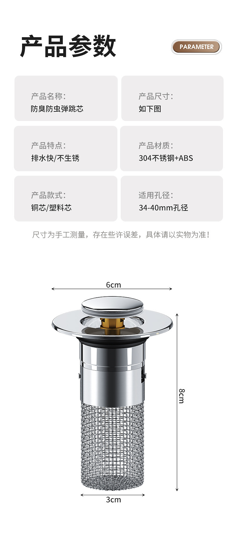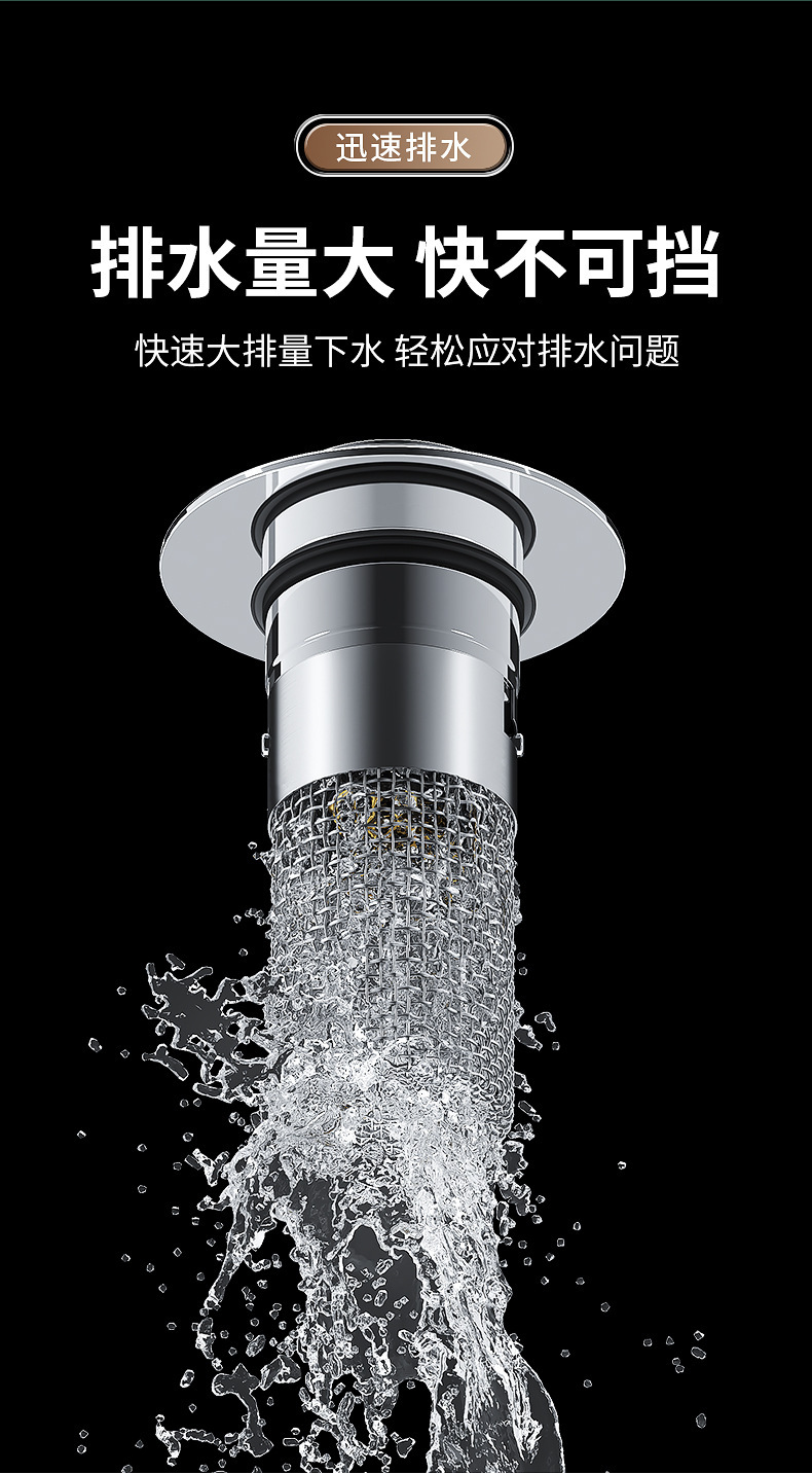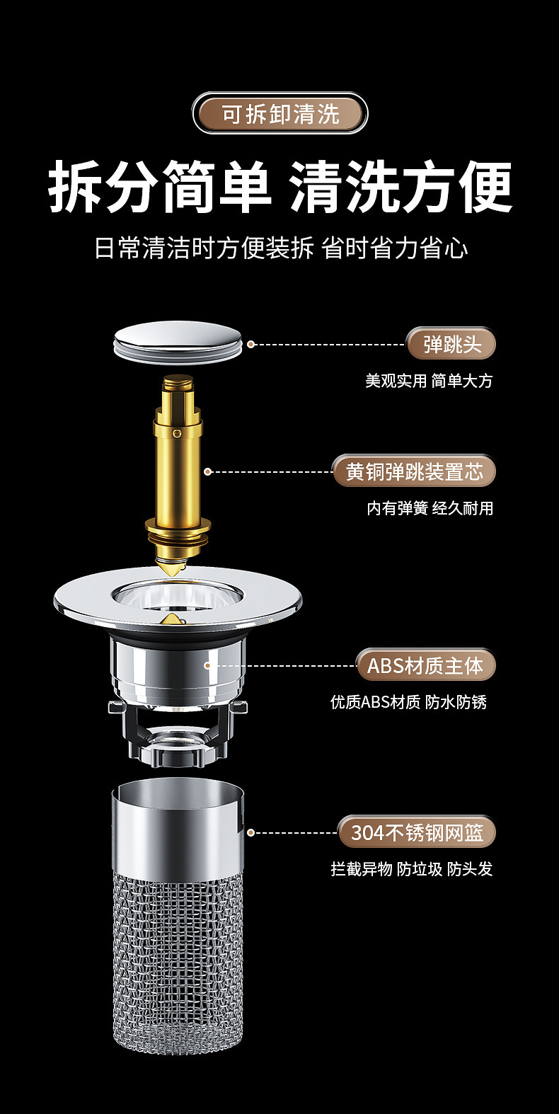 面盆洗手盆通用弹跳芯304不锈钢防臭堵孔塞洗脸盆按压式下水器过