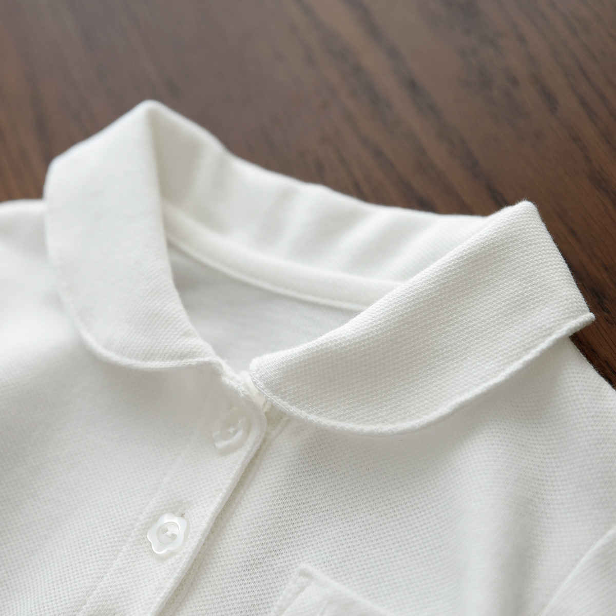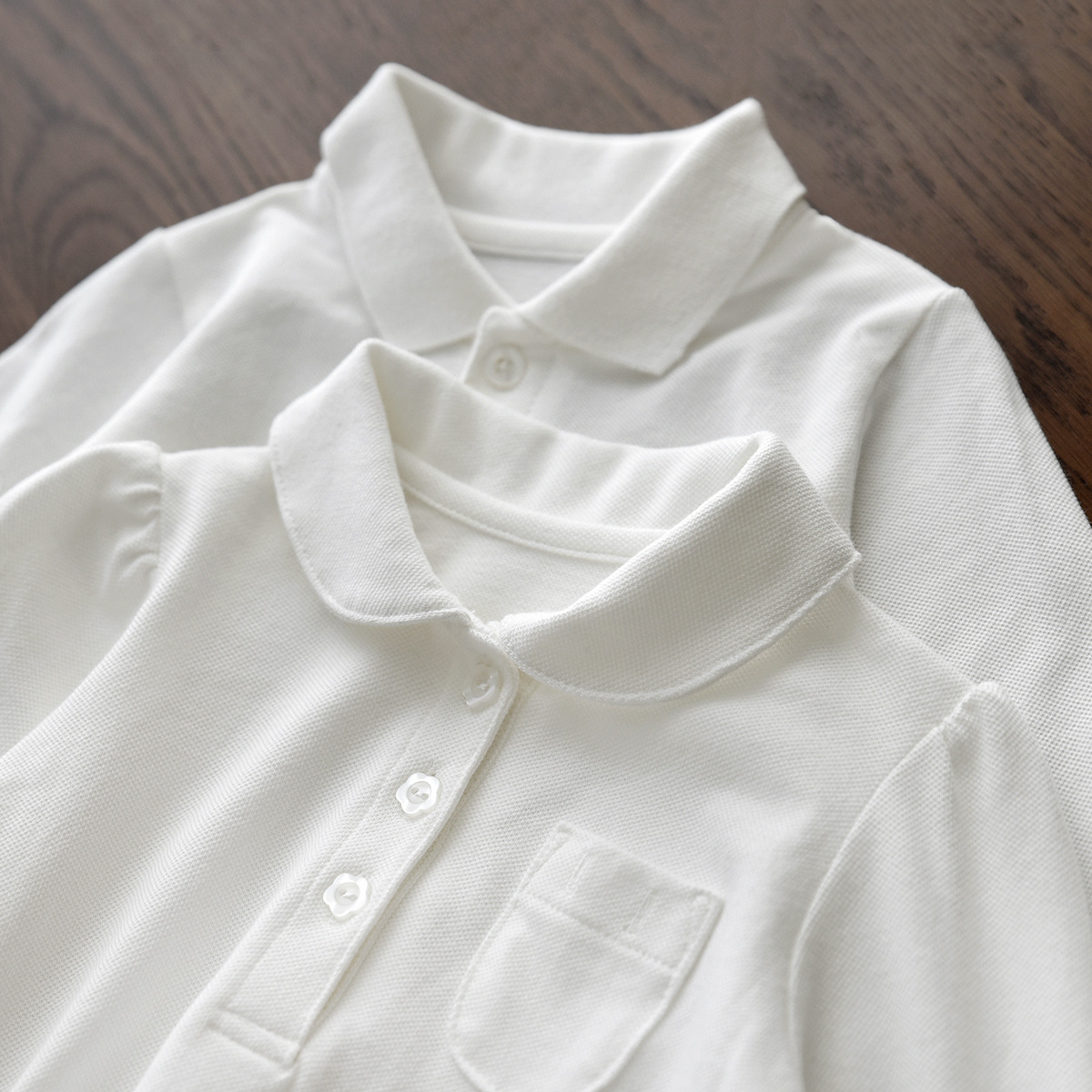 圆领是女童款,前面是花瓣形扣子,小泡泡袖,袖口收口