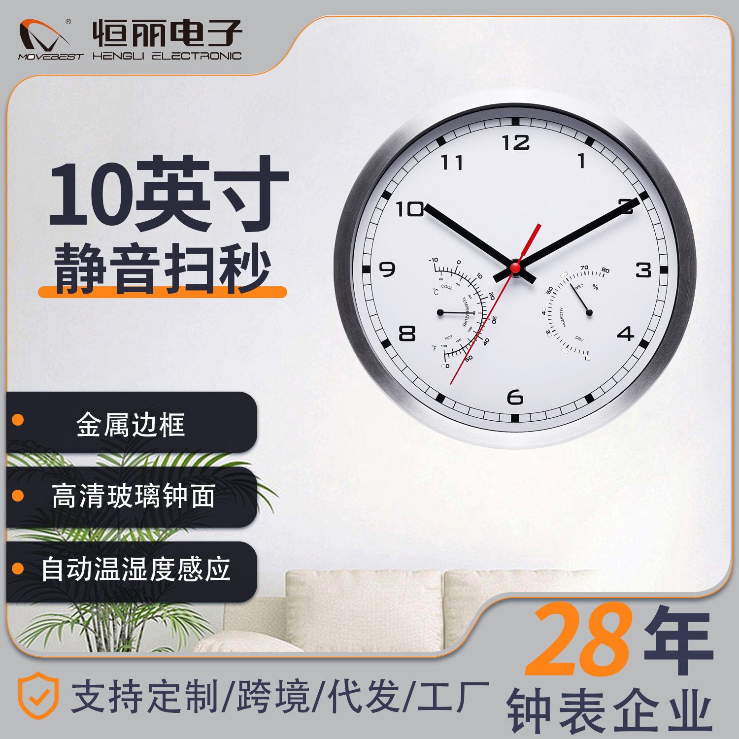 恒麗シンプル10インチ掛け時計リビングルーム静音アルミ合金フレーム時計壁掛け温湿度表示時計