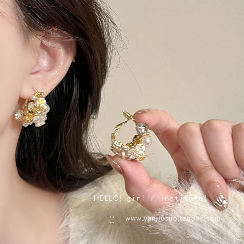 2025新型レトロ重工真珠花輪耳掛け女性軽豪華高級感イヤリング絶美気質爆金耳飾り